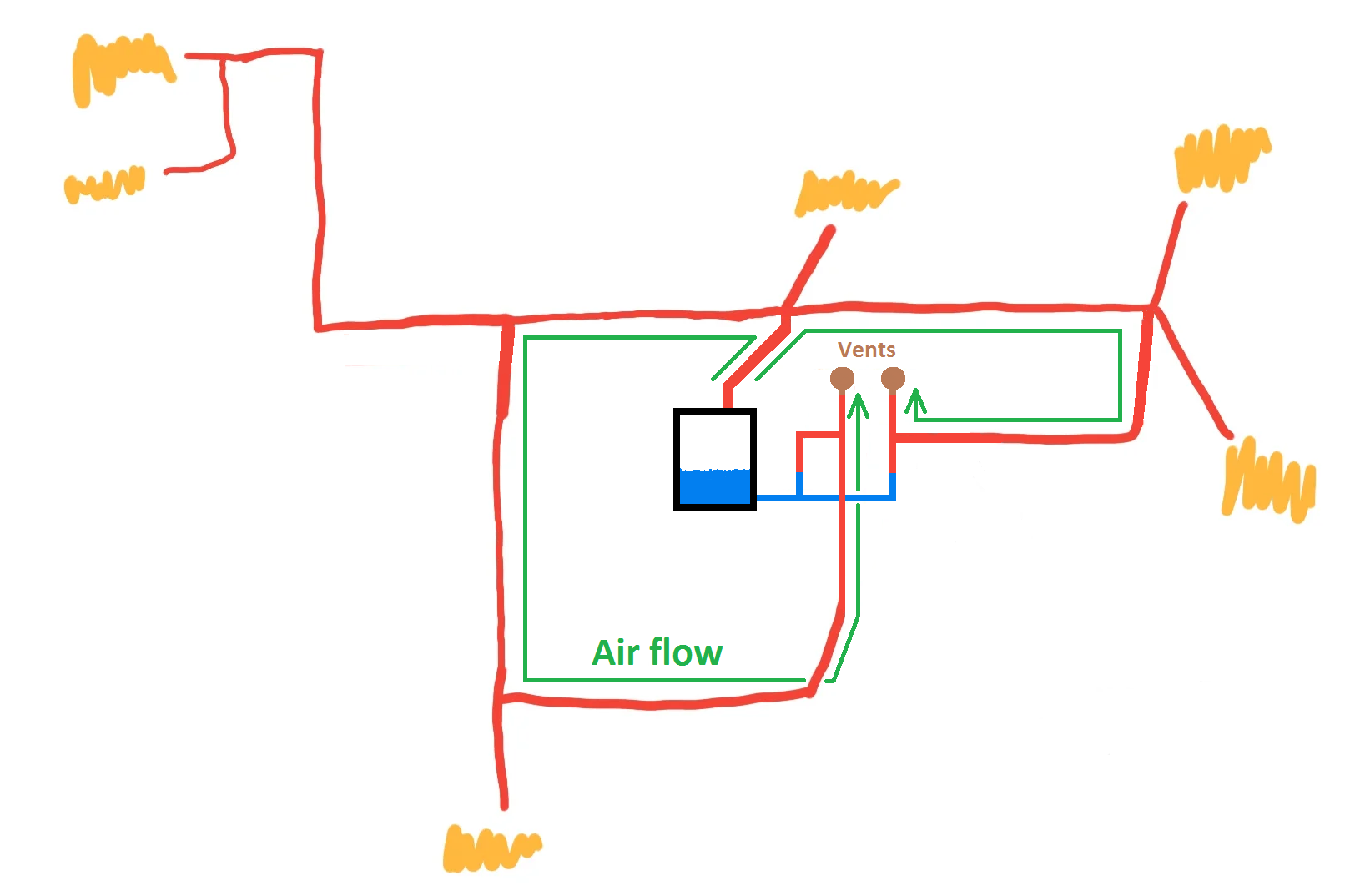 Here is an example of @EzzyT beautiful work. Green arrows air flow, Blue condensate. The actual vents are hidden behind the main pipes, the vent pipe on the right can be seen the left vent pipe is mostly behind the conduit. Two separate drips down to the wet return.