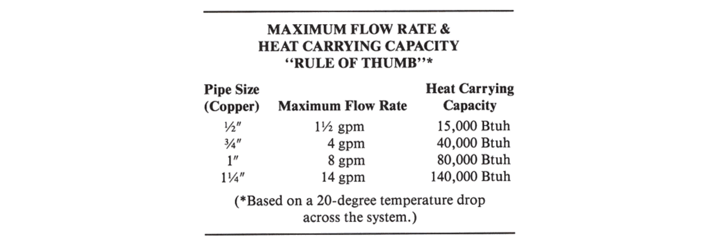 So, a series of pipe sizes that includes any significant length of 1/2" pipe would limit that branch or loop to about 15,000 BTU/hr.