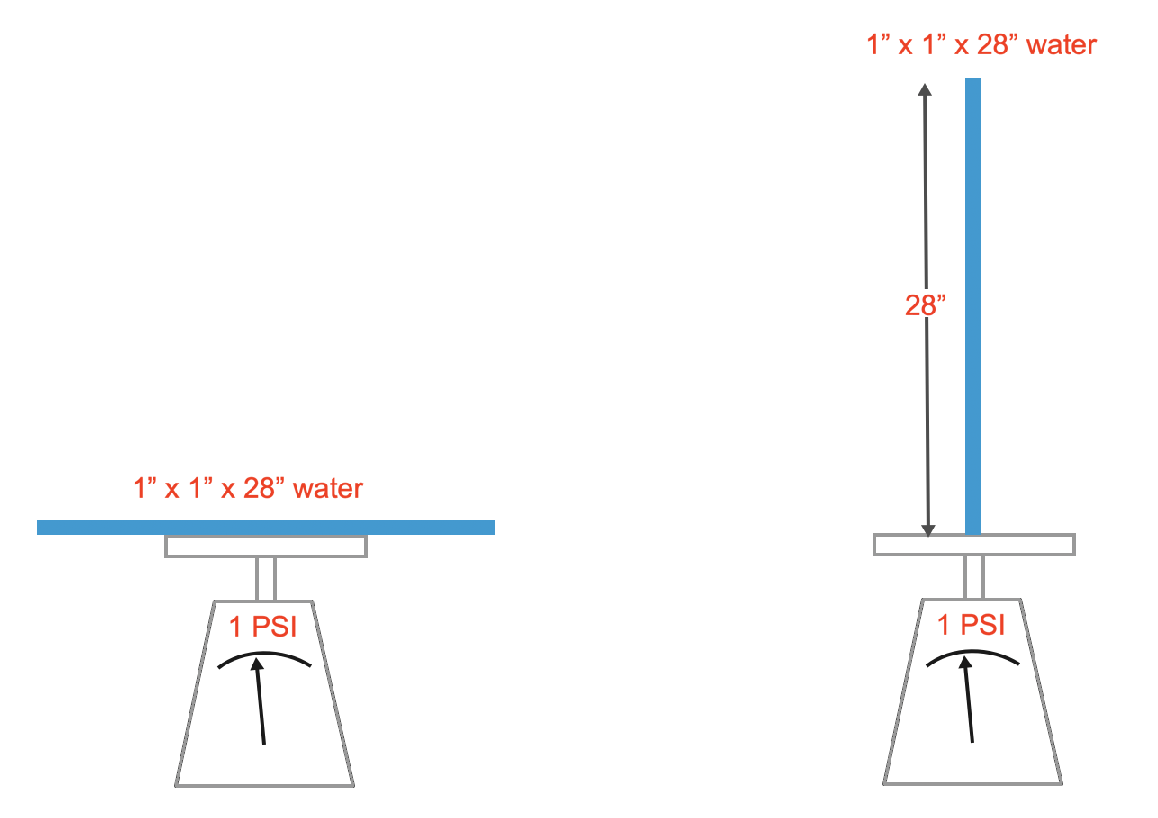 Here is an illustration that helps understand Pounds per Square Inch (PSI). If you take one pound of water and place it in a container that is 1" x 1" it would fill that container up to the 28" mark. That is one pound of water whether it is horizontal or vertical or in any other position. That is always going to be one pound of water regardless of the dimensions.