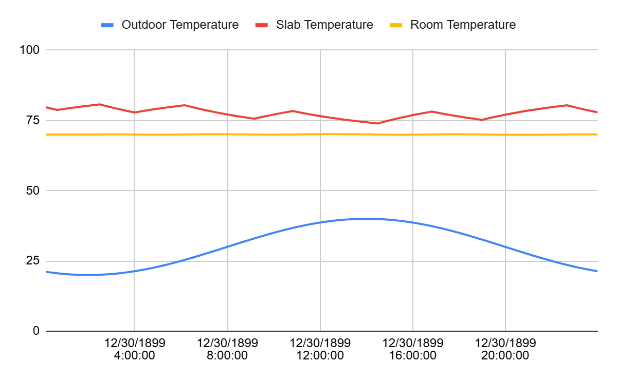 The control strategy is very simple: if the air temperature is above the thermostat set point (70F), turn off the boiler, otherwise have it on and applying its full load to the slab.
