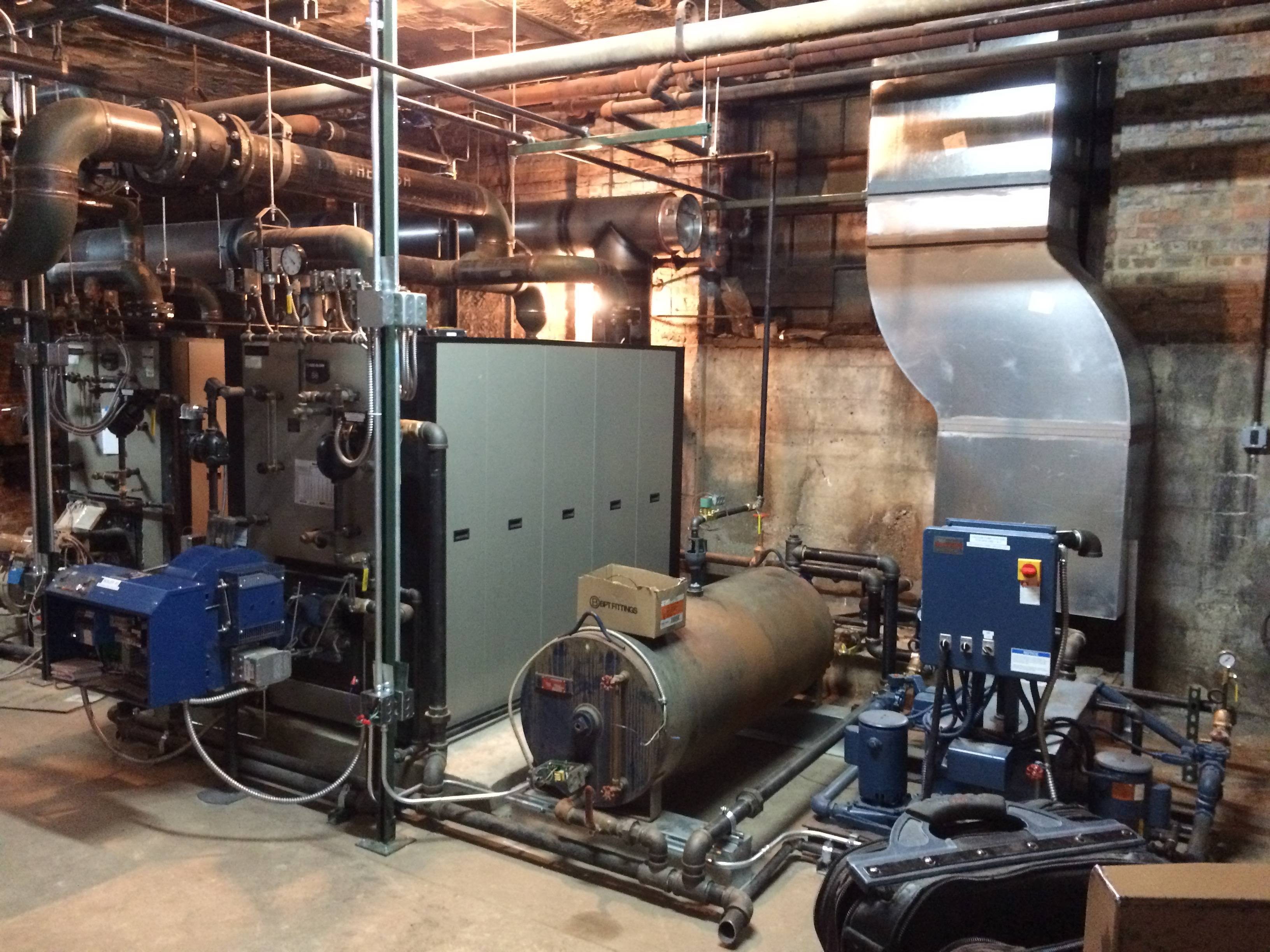 22. I find the engineer draining gallons and gallons of water out of radiators. In the old boiler room, I find a condensate pump and tiny tank that apparently none of the installers knew was there which pushes water the 12' up and over the old abandoned Herbert boiler and back into the return line that runs all the way back to the new boiler room. It is, of course, open the atmosphere. Put my hand by the vent and it sucks my hand right to it. Alrighty then.