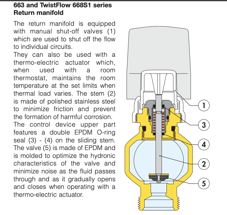 When you remove a cap and screw an actuator on, it closes the port, as the thermal motor warms the pin (#5) rises up. It lifts the washer #5 off the seat.