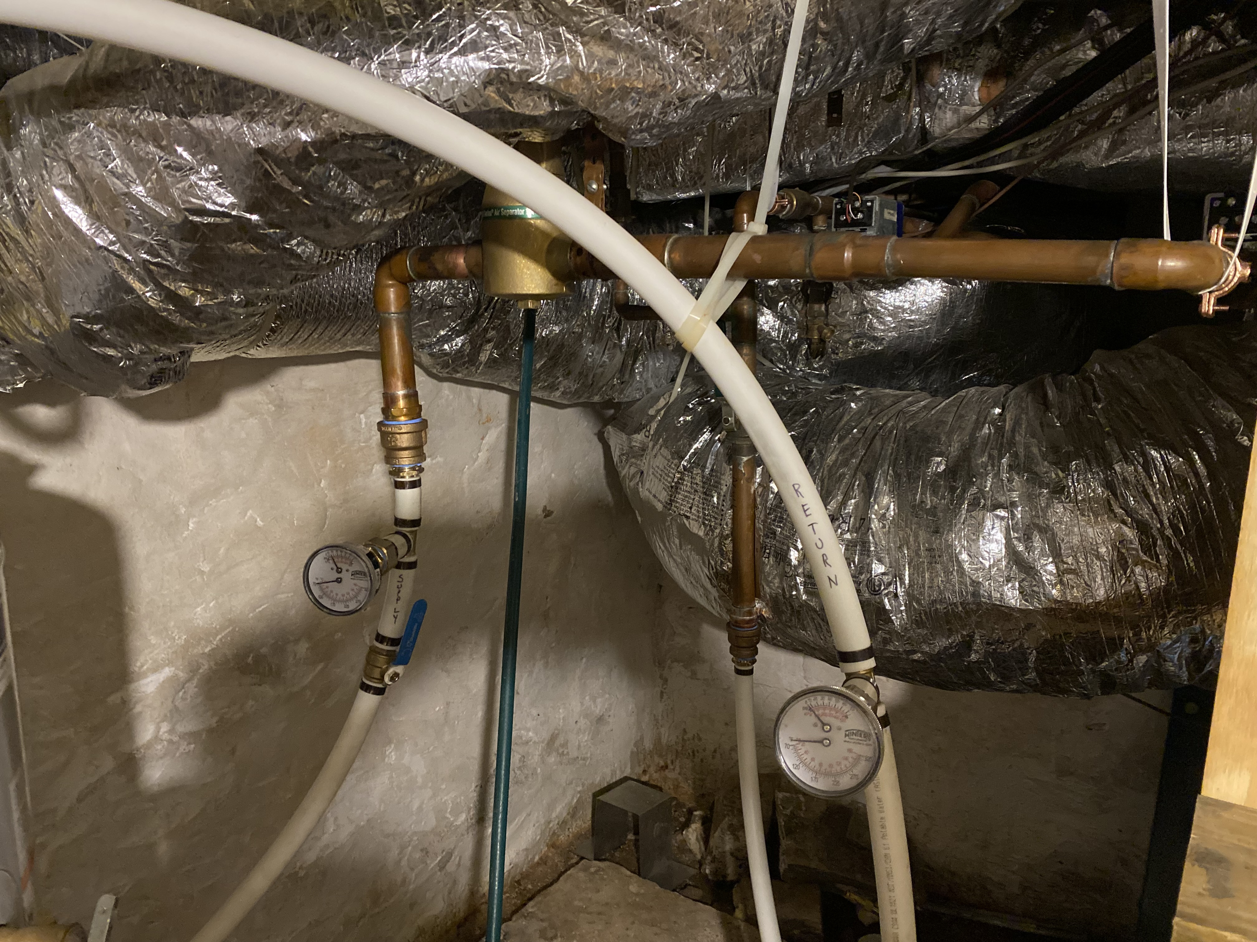 One thing to note is that I have a T right before the downstairs zone return “manifold” and it has valves to shut off each side. I know very little about the routing and design of the baseboard pipes themselves; but I am learning more everyday! This last purge I closed one at a time to see if maybe there was air trapped in the “parallel” loops within the downstairs zone. One side was simple to purge but the other never relented in the amount of air being forced through the pipe and out the drain. This was even with the fast fill, pump running at 38w and 170deg water.