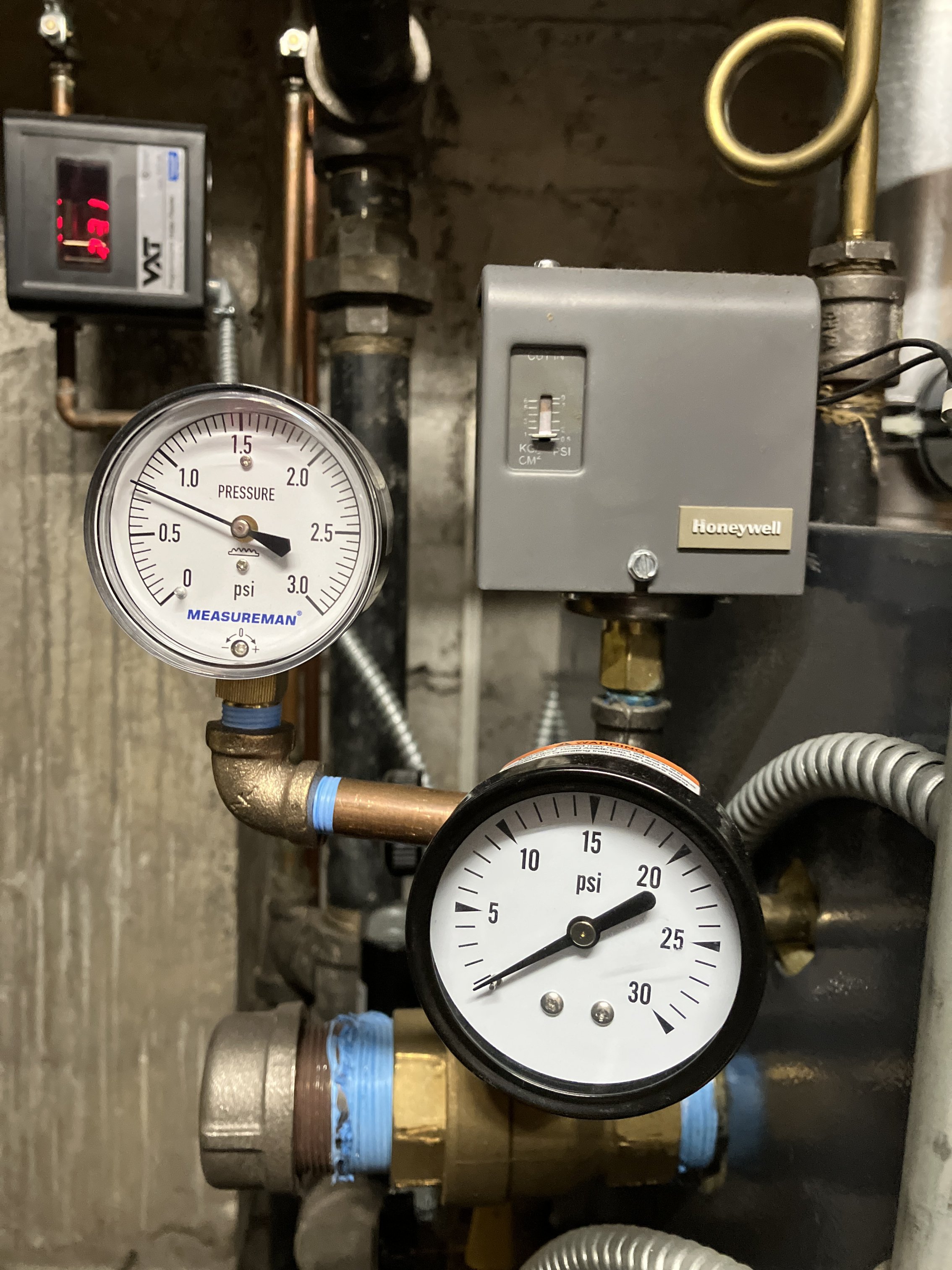 Two other comments: that 0 to 30 psig gauge is required by code — but is almost useless for figuring out what a boiler is really doing. I would add a 0 to 3 psig gauge somewhere — the easiest thing to do is to mount it above the existing gauge in much the same way, and then the pressuretrol on top of that.