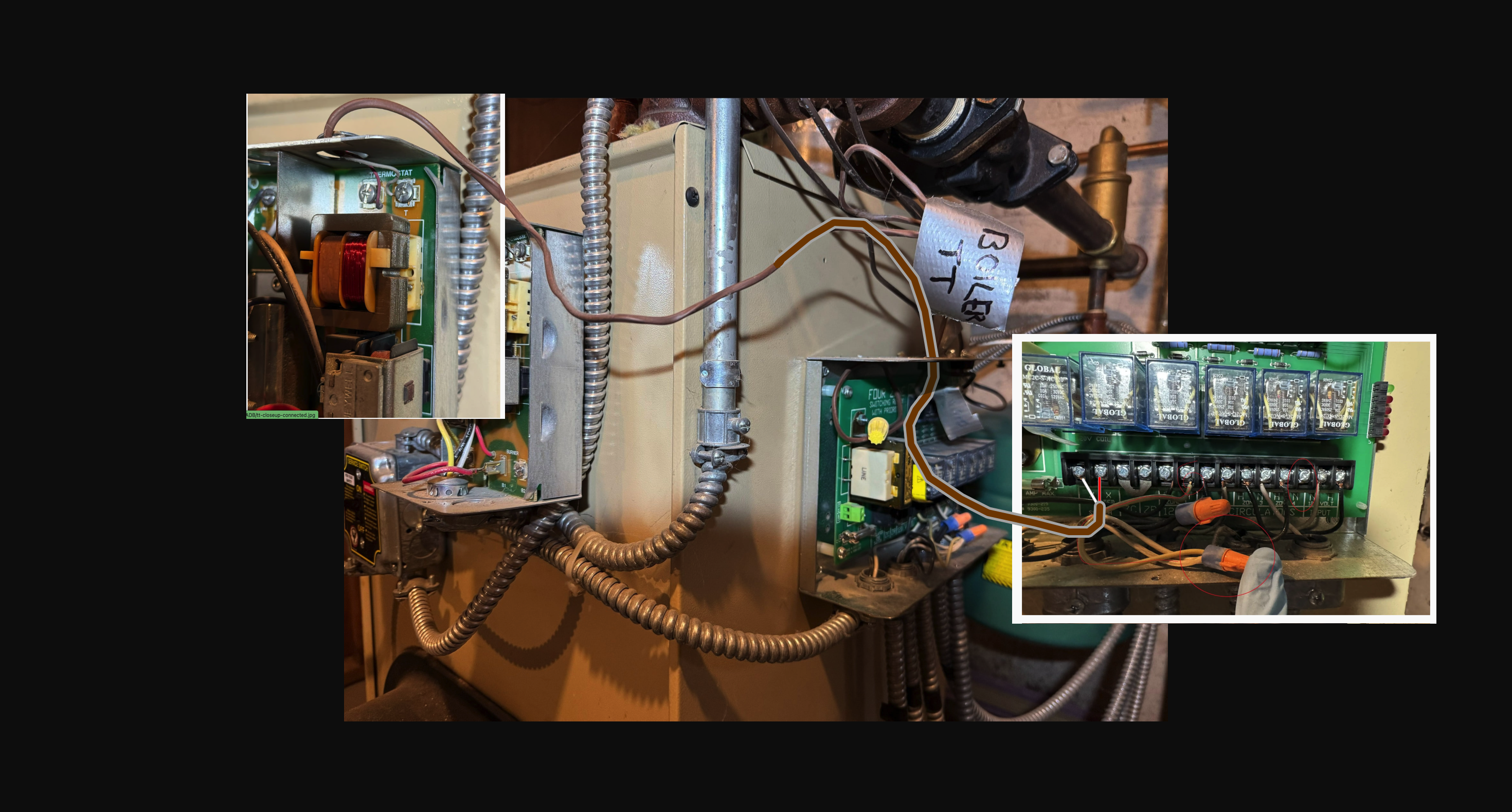 At the zone panel, there are 5 BX cables feeding the 5 circulators. However, I only see 5 total low voltage wires going into the zone panel. There should be 6. 5 for the zone thermostats, and 1 for the isolated end switch between XX and TT. Something isn't wired correctly.