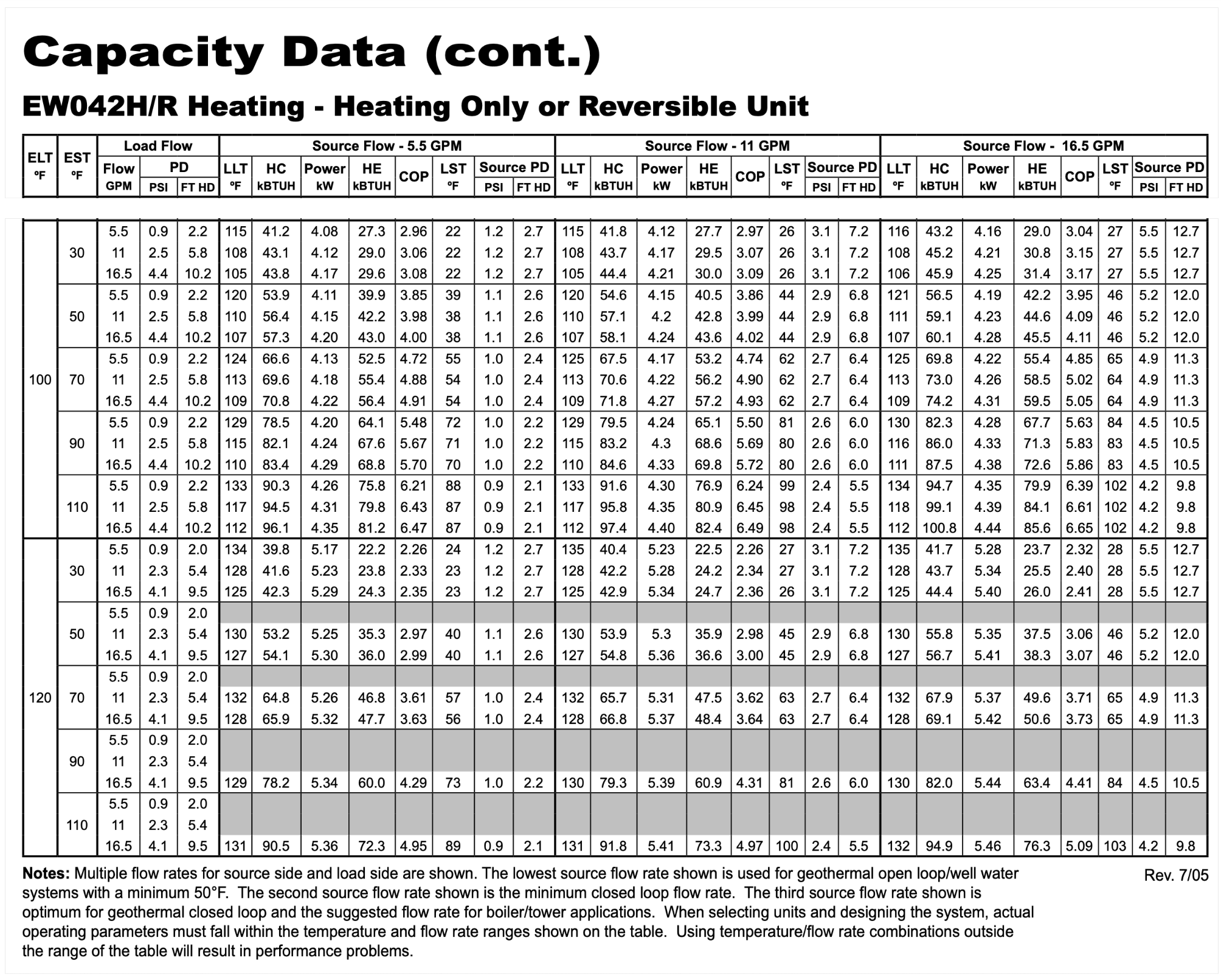 Ok, for the max heating application given for the EW042 in the spec tables (approx. ~120F given to load circuits), for a given ELT (entering load temperature), if you look at the HE column (heat extracted) for each EST row (entering source temp) and Source flow (5.5, 11, 16.5 gpm), the kbtu/hr increase is minimal / in the noise band. But as EST increases, the kbtu/hr increases significantly.