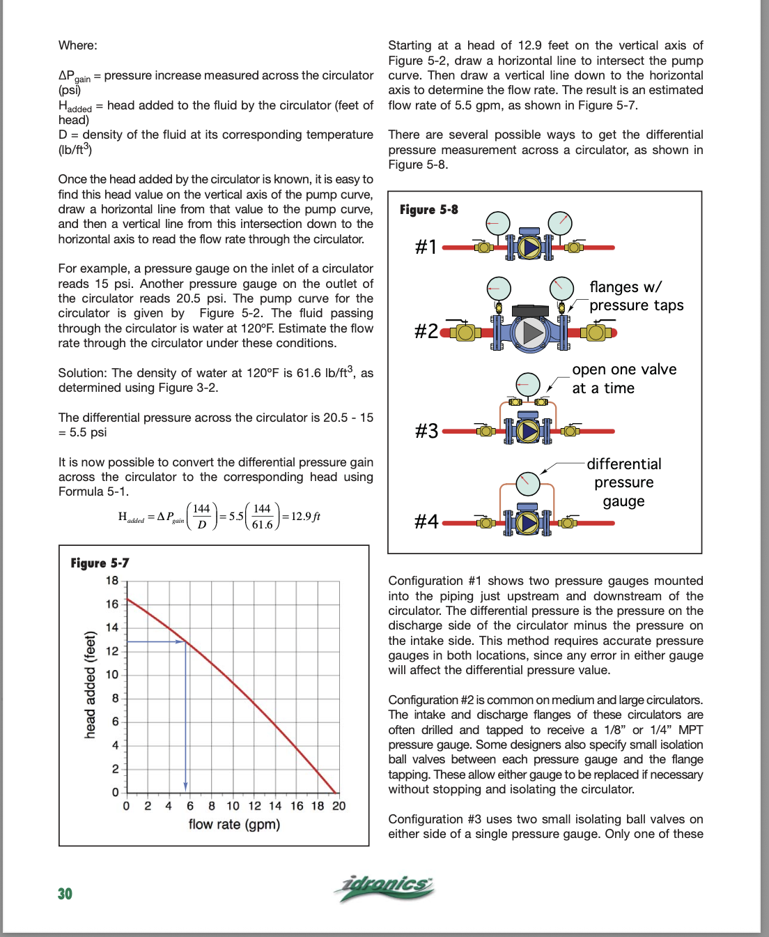 Here is the math for calculating system flow, from Idronics 16. You need a pressure gauge and a means to connect it on both sides of the pump. I prefer method #3 so gauge error is eliminated between two gauges.