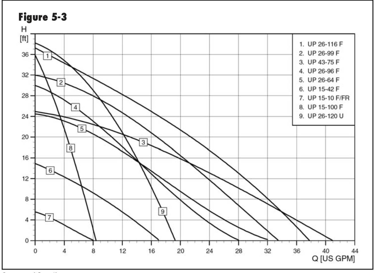 If you need more flow I would series another pump to the one you have. Two Grundfos 26-116 in series, Fig 5-19 below, get you 16 gpm at 50' head. Use pump curve #1 on the chart showing all the pumps