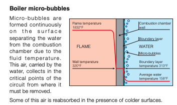 Microbubbles form inside the boiler everytime the flame hits the cast iron. Unless they are completely eliminated they go in and out of solution as the water heats and cools. The pic below shows a cross section of a boiler casting