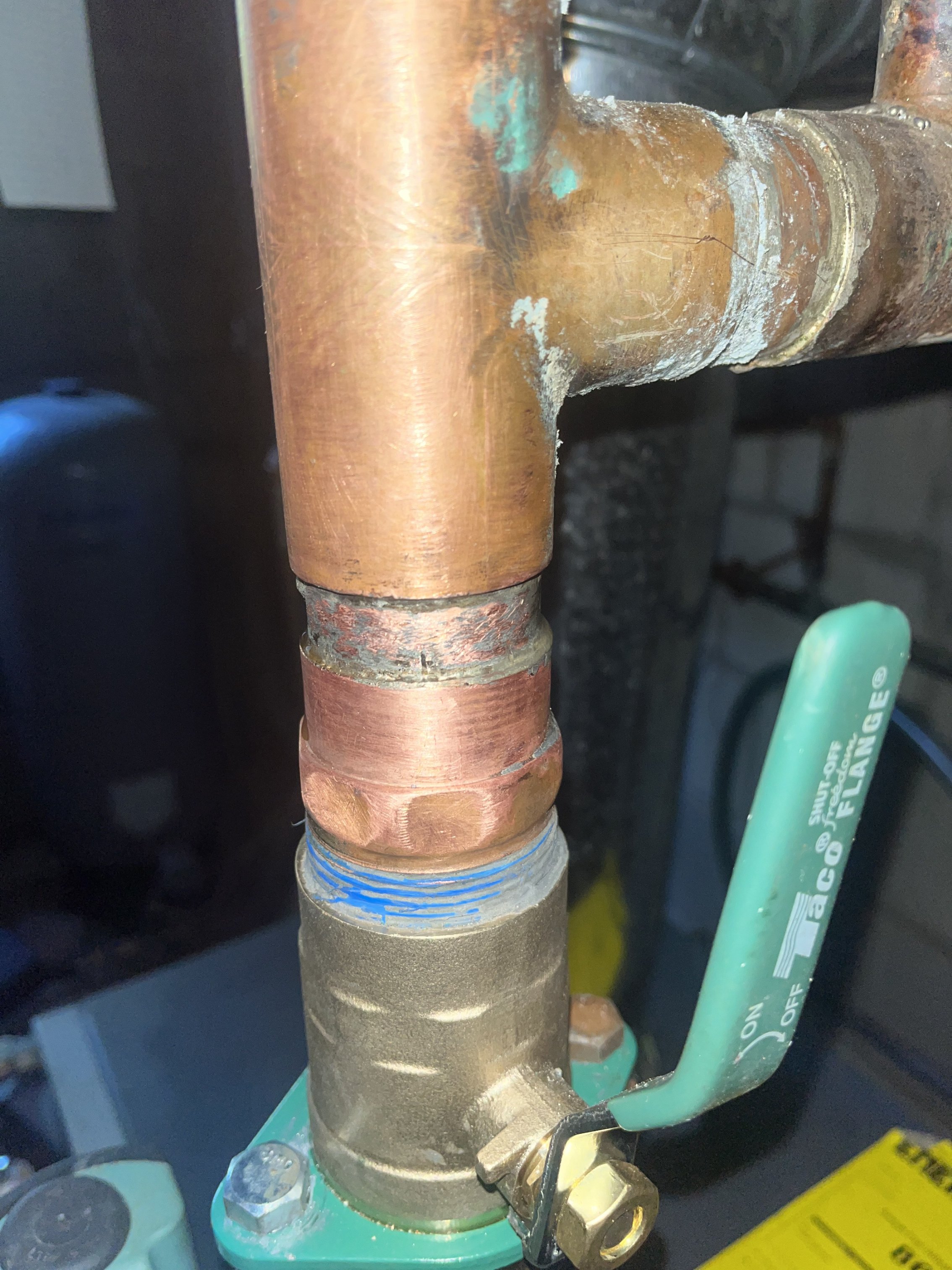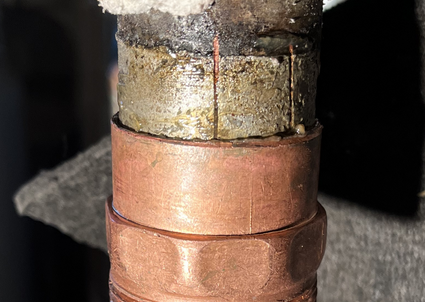 So, last fall I tried to unsolder the leaking adapter to replace it but it just wouldn't come off, so I lived with the leak for the winter. I tried again this September with a hotter torch tip, but it wouldn't come off, so I went to Plan B, suggested by @mattmia2, which was to cut slits into the adapter (which I did with my Dremel multi-tool), heat, and peel it off in strips. It worked like a charm. Long story short I got the new adapter on and felt like a hero until I saw this one was leaking too, maybe a little more than the old one, and I think it's also leaking at the top edge of the little nipple. (I might have inadvertently unsoldered that too, despite the application of heat paste at the nipple/tee joint—thank you @HVACNUT for telling me about heat paste, it's great stuff—which might be too close to the joint I was trying to unsolder for even heat paste to help.)