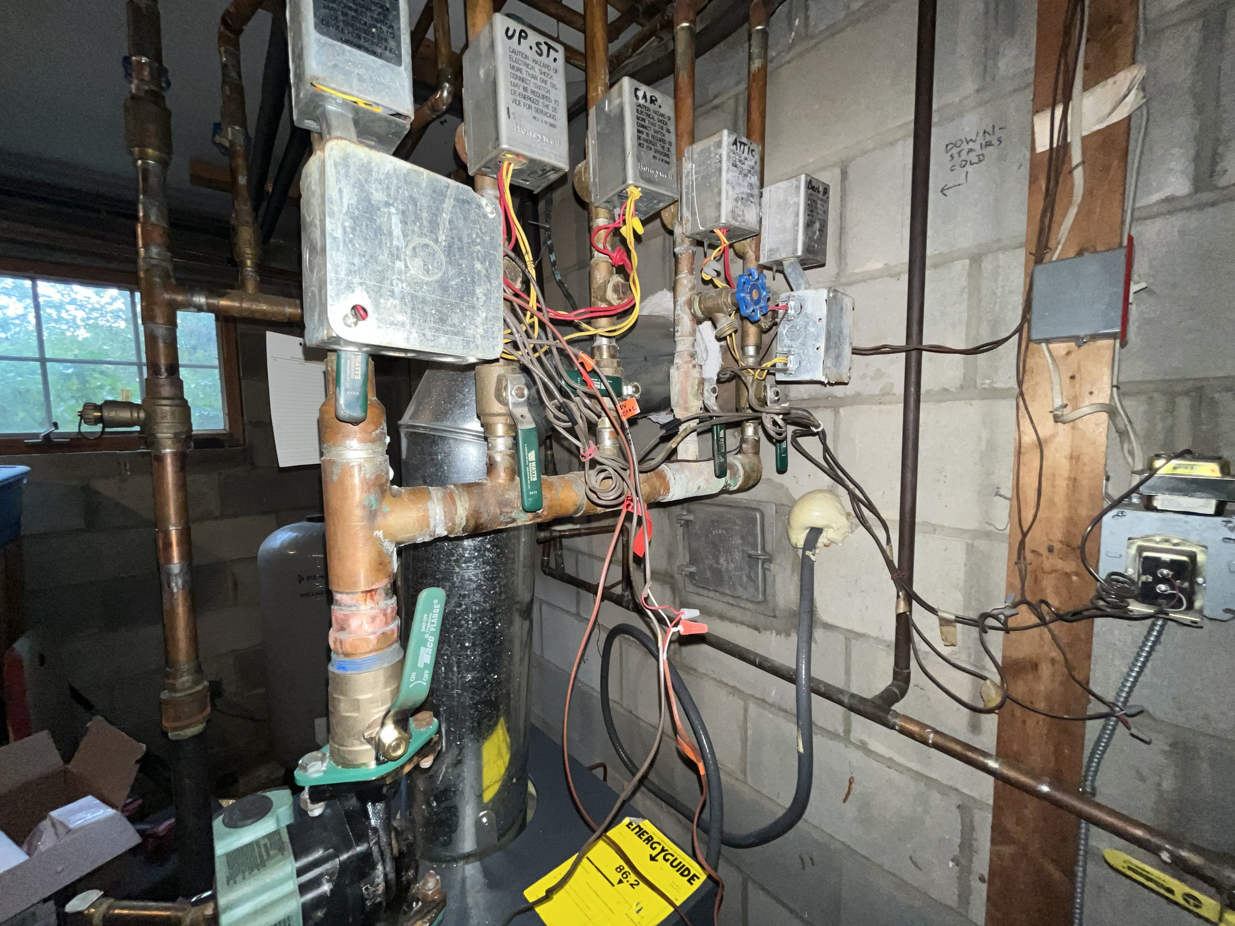 4. By now he also wanted to rebuild everything manifold and above and replace all the zone valves with identical new ones because these are old, and to redo the wiring, which is admittedly messy and ugly but so far works fine. He also noticed that my one year old Caleffi combi auto-fill/backflow preventer was dripping from the provided port on the backflow preventer, which it has been, chronically; but I figure that just means it's time for me to clean it as Caleffi suggests. I mentioned that, but he said we could just plug it up so it won't drip. A short time later he mentioned that as part of this master plan he wanted to replace the whole combi unit, since it obviously wasn't working right.