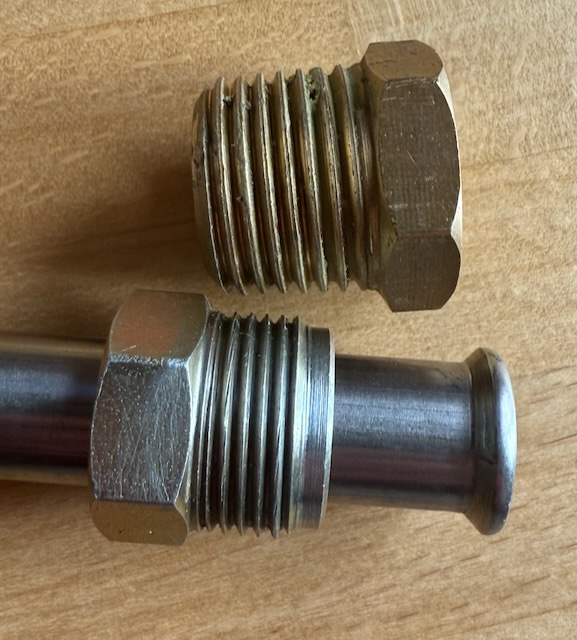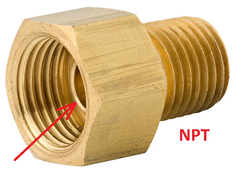 The picture below shows a pipe with sliding nut that needs to be connected to a gas valve with 1/2" NPT thread (2nd picture). Which adapter do I need? For comparison, I've put a 1/2" NPT brass nut above the pipe section. The sliding nut has ~0.75" OD and is not flared. Thread count is ~16.5 per inch.