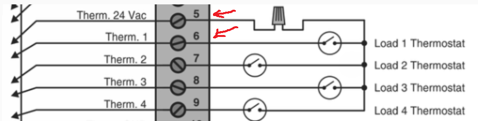 I would expect the XX to be connected to one of the Thermostat inputs, Load 1 through Load 4 .