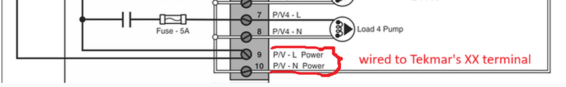 If I had to guess, the terminals 9 &10 probably supplies the 120 VAC power to the Tekmar 306V. It is not connected to the XX.