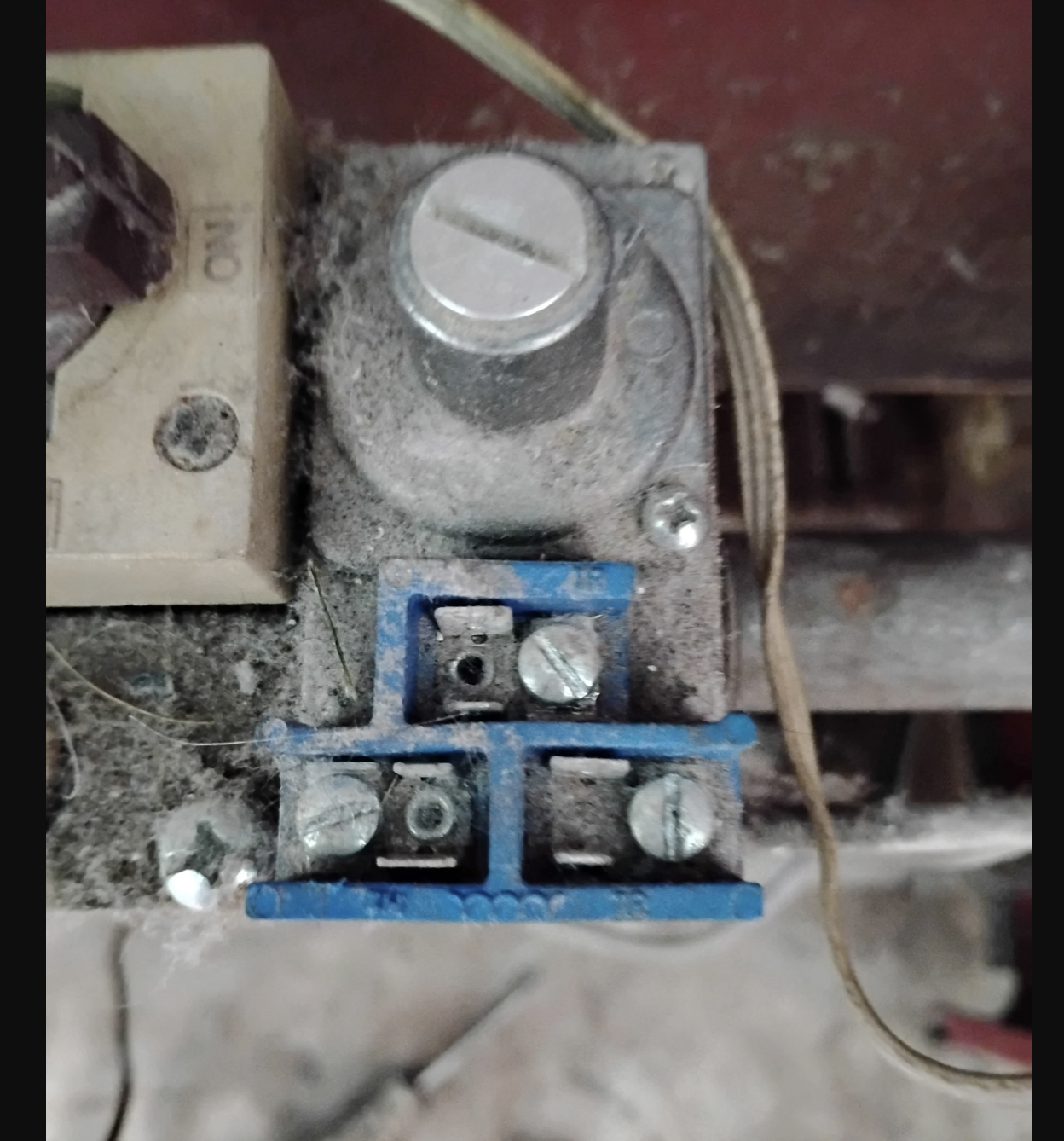 This photo indicates that your heating boiler is located near your clothes dryer, and that clothes dryer vent is allowing lots of lint into the boiler room area.  All the telltale dust on the gas valve tells me that there is most likely dust on the actual burners inside the fire compartment, and the combustion air openings of the burners.  That dust can lead to insufficient combustion air and incomplete combustion.  That can lead to the boiler heat exchanger getting a build up of soot and carbon that will cause more problems that you do not want to deal with, some day this winter.