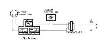 This is most likely where you have the three disconnected wires.  I have indicated that one of the three wires is Red and connects from the transformer to the R terminal on the aquastat.  The W on the Aquastat will get connected to the TH on the gas valve indicated by the white wire in the drawing.  Then the TR on the gas valve will get connected to the transformer  indicated by the blue wire on the drawing.