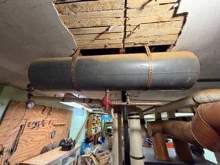 The big greay horizontal tank is called a compression tank, and it should be half full (more or less) of water. There should NOT, repeat NOT be any other air separator on the system. Rather it should be piped so that any air wandering around in the system can be picked up by a pipe and make its way into that tank.