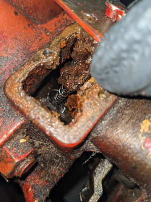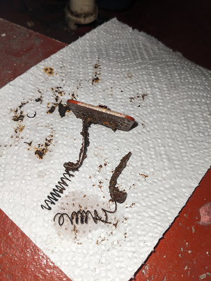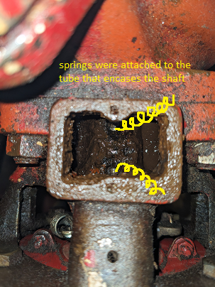 Until now, I have been oiling it through the little flip top hole on the oil reservoir, but this time, I decided to take off the little plate and oil it that way. Unlike other Bell & Gossett pumps I've seen, the plate was not retained with clips, rather, there were springs holding it down. One of the springs was still attached to the shaft encasement, and the other one had already broken off prior to me opening the reservoir. I couldn't figure out how to detach the spring, and it eventually broke free from the shaft encasement. Also, there was not any rope inside for wicking the oil like I've seen in other pumps.