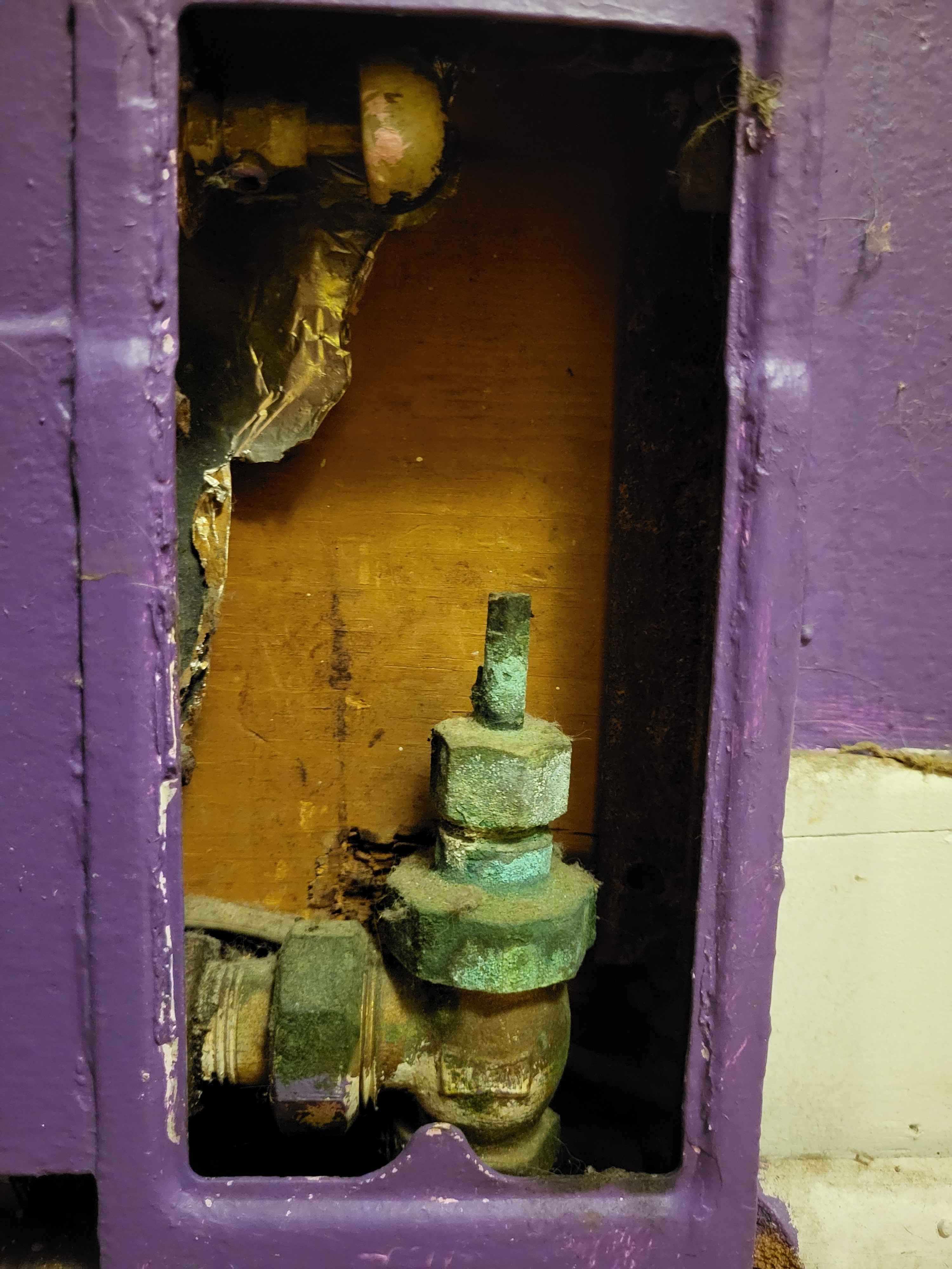Could someone kindly instruct me on which piece in the provided picture should be turned to close off the hot water to the pipes? I'm also worried about these pieces breaking as they look so old.