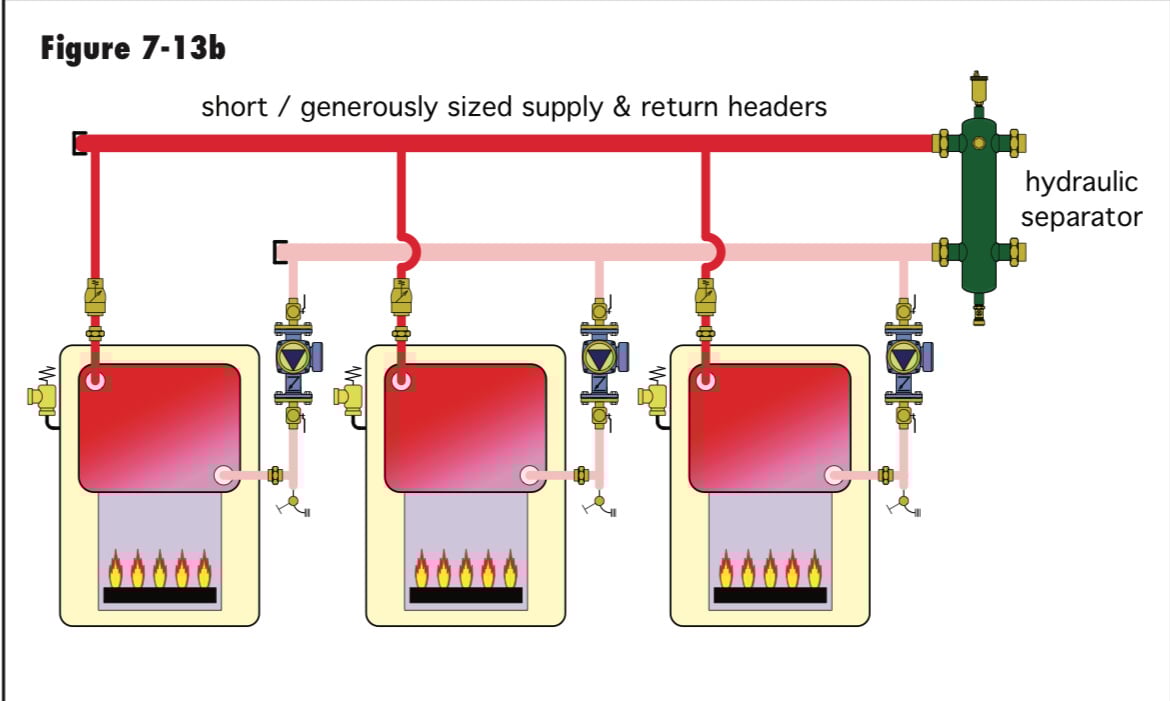 From my self-education using Dan's books and Siegenthaler's book, I am thinking that this should be a relatively simple enough installation to accomplish, as far as building a primary/secondary loop system goes. The new boilers will be flipped 180 degrees from the old ones, and as far as I can see, I should be able to run a design similar to the one on page 135 of Dan's book "Hydronic Radiant Heating" where each boiler is it's own individual secondary loop that can fire using the Tekmar to cold start when it's that boiler's turn.