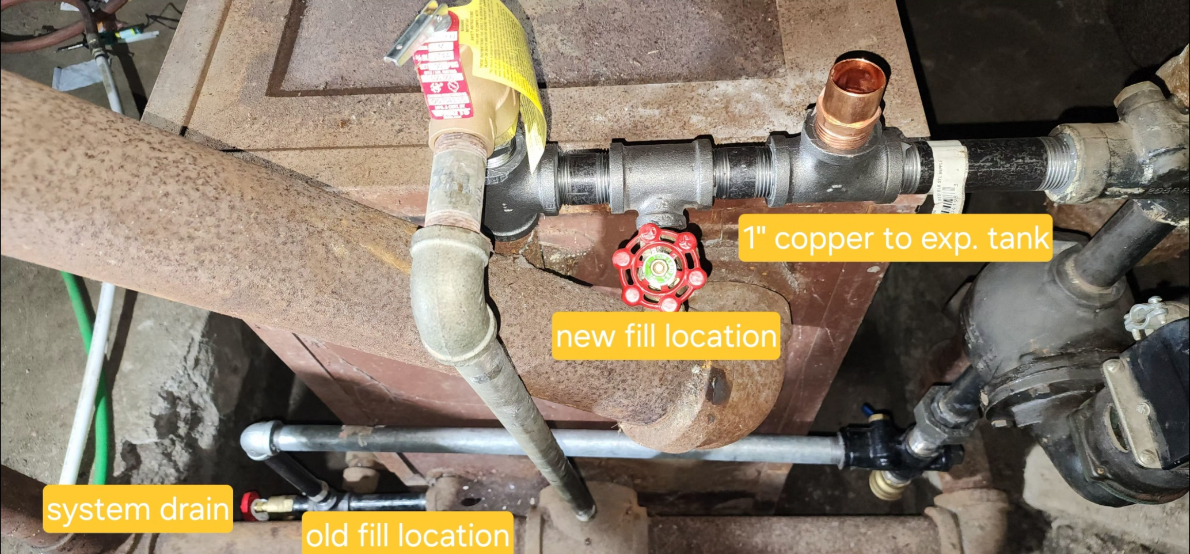The orginal fill location was at the bottom next to the drain. It now connects to the lower port of the LWCO. The tee on the top tapping below the pressure relief orginally hooked up to the steel compression tank. Now it has a 1/2" port for the new fill, a 1" port for the new 33 gallon bladder expansion tank and the upper connection of the LWCO.