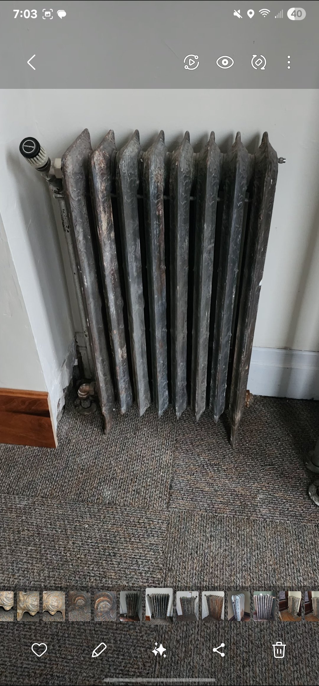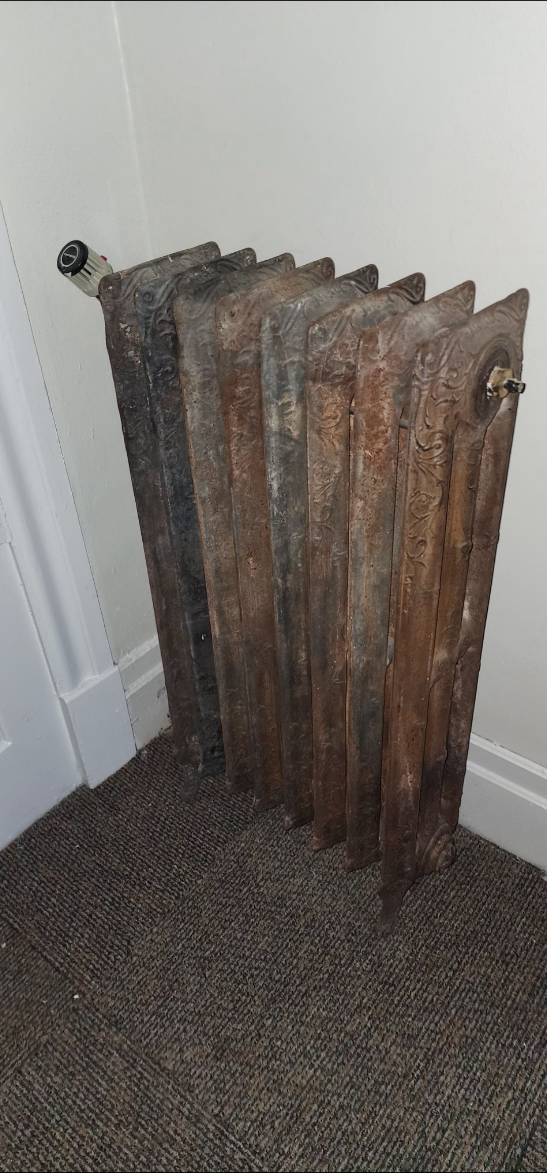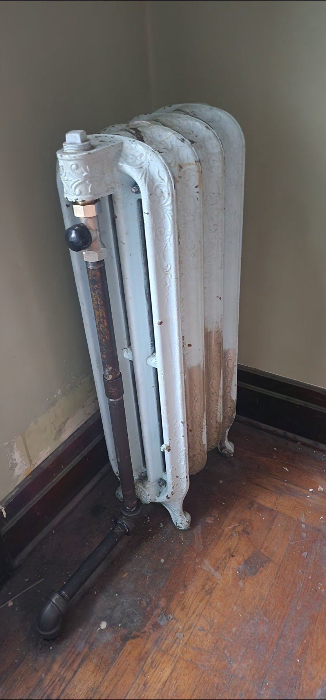 My first big break came in the form of 10 used radiators for $200, of these, 6 ornate ones were particularly useful to go where the orginal gas space heaters were located. There were three with 6 sections and three with 10. They happened to be the correct height and configuration of inlet and outlet. The only downside was they were all tapped for 3/4" fittings and the pipes were almost all 1". I needed 6 equally sized radiators. I stripped the paint, cut the tension rods seperated the sections, retapped to the larger thread and ended up with six 8 section radiators. If i were to detail how i accomplished ask that it would be another 10 horrors. These radiators went in with v110 thermostatic regulator valves. I picked up, stripped and installed several more radiators and sorted out that aspect of the heating system.