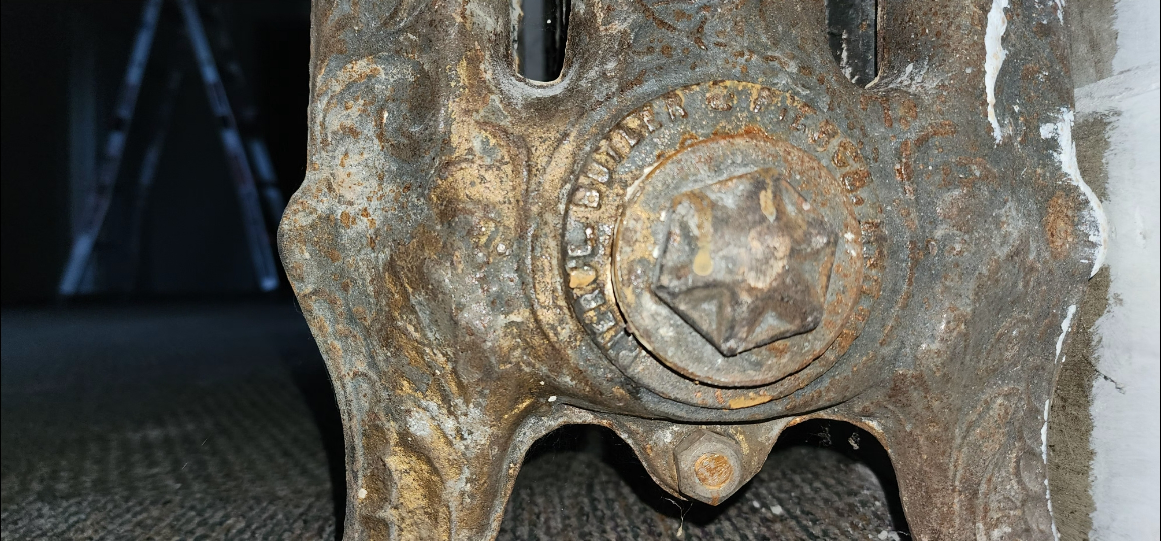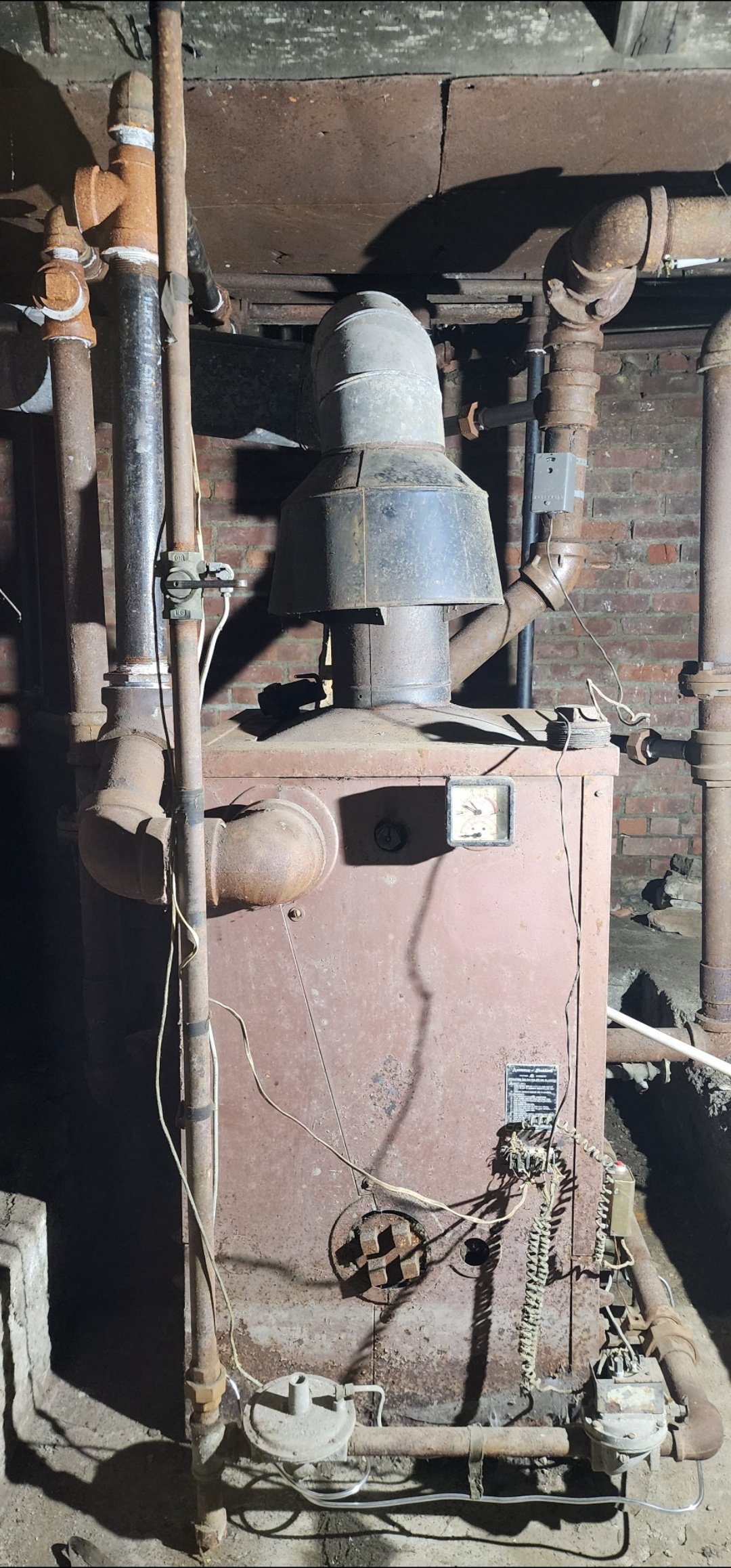 Fast forward to my ownership. All copper pipe had been stolen from the reconfigured 3 heating systems as have the ornate radiators in the upstairs apartments and corresponding boilers. The large 4" supply and return lines are no longer attached to the basement joists and have sank several feet.