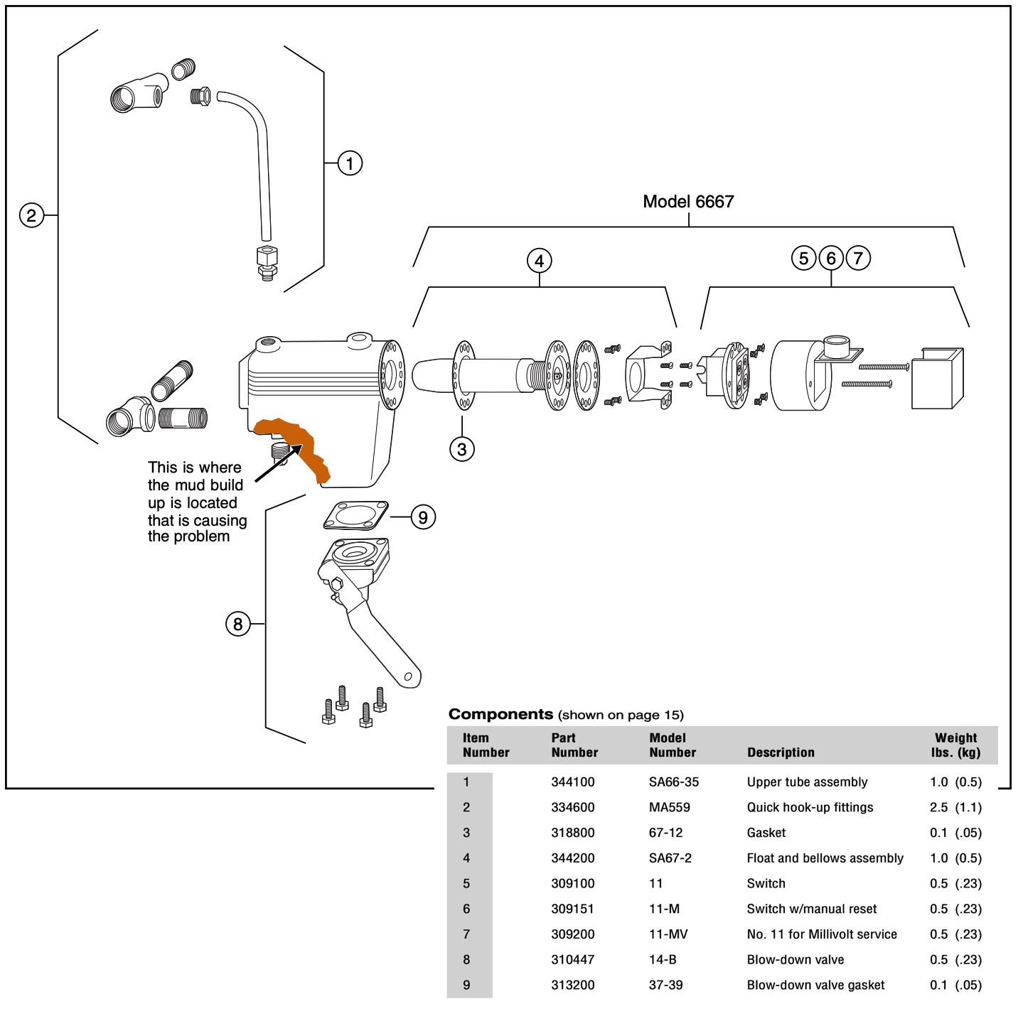 You need to take apart the #67 LWCO and clean it. It is also possible that the float has a pinhole in it and its full of water.