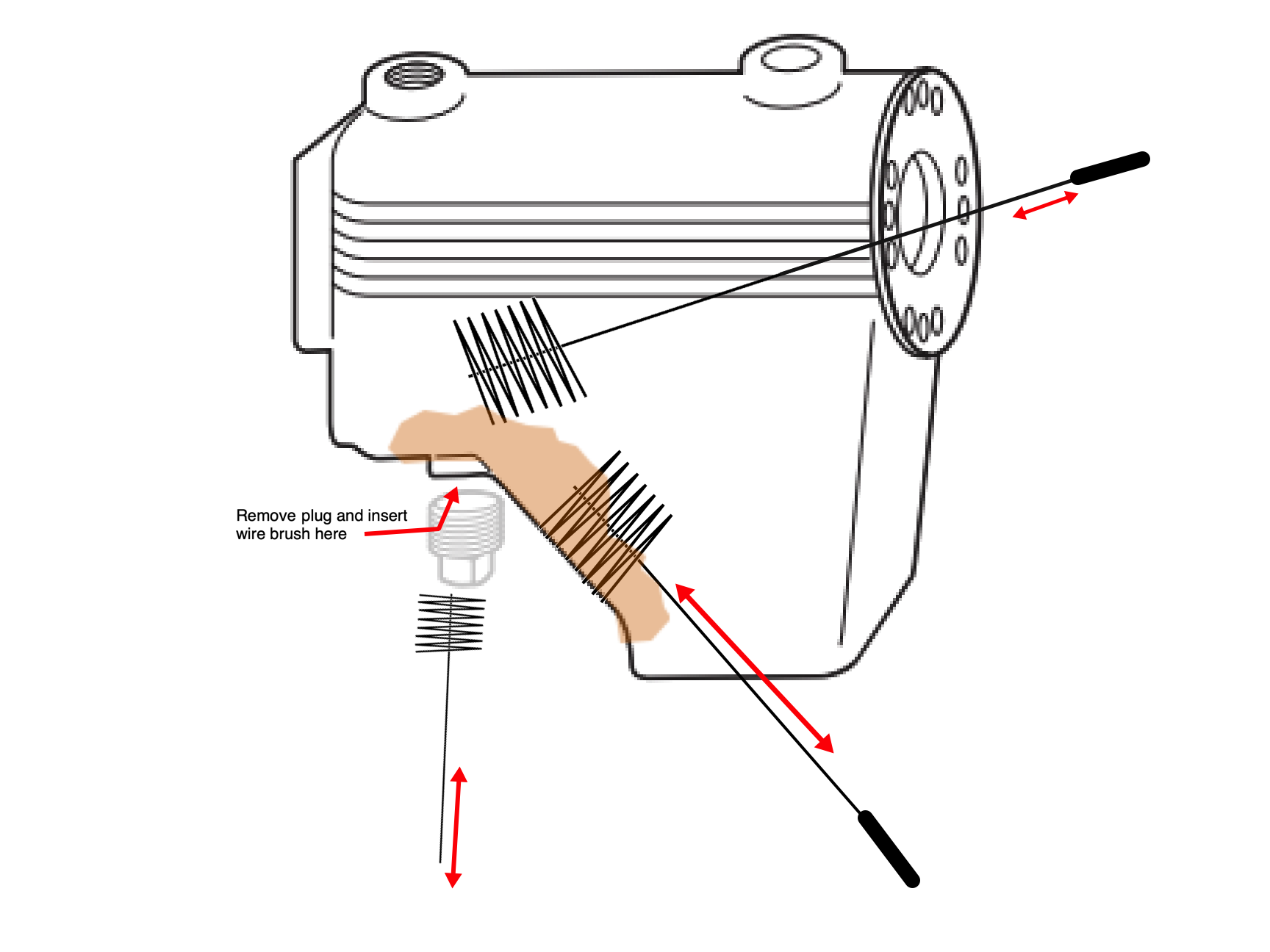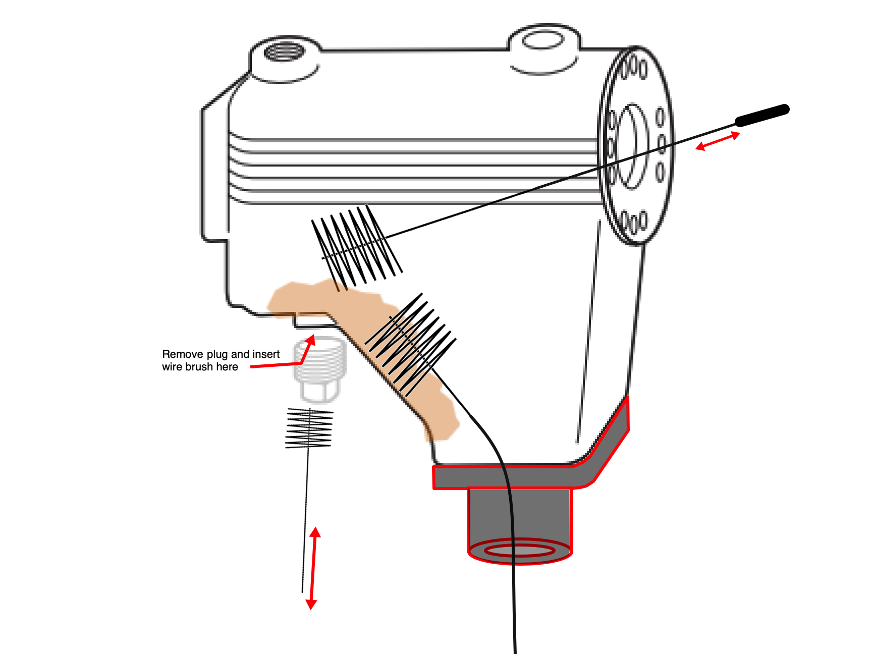 Yes you do need a stiff wire brush and some type of scraper or large screwdriver. The type of wire brush is not too critical as long as you can get it into the housing to do the job. You probably don't need a 30 inch long one just long enough to reach the tapping on the far side and maybe go into the pipe. I suppose the longer one the handle could be bent for better ergonomics.