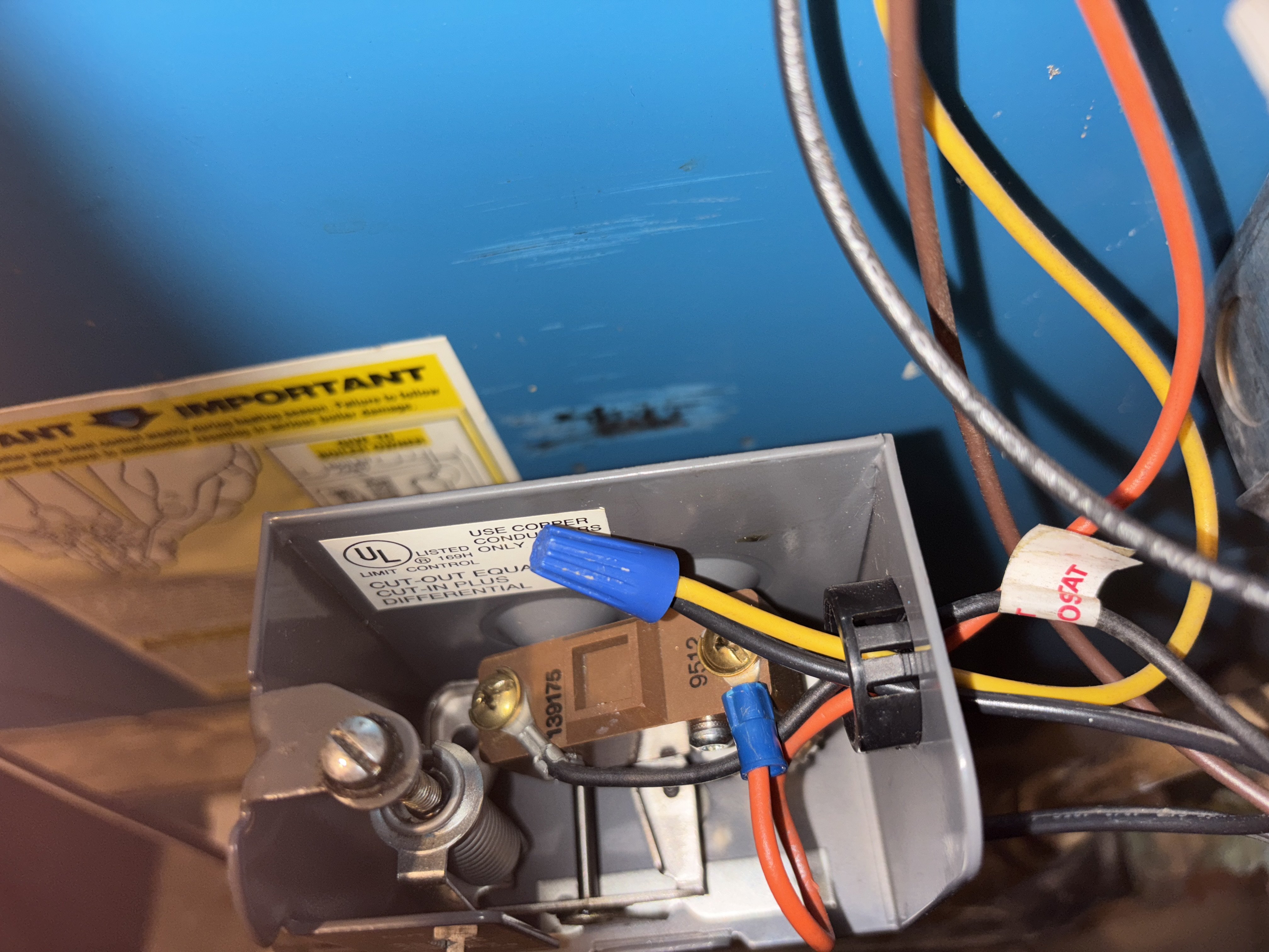 I should have taken a photo before I disconnected it but I made a mental note that the orange wire was on the right and black on the left. Hope that is right. You’re right about using the pressuretrol as a junction box. The black wire from the Iwco and a yellow wire going to the damper are tied together using a wire nut.