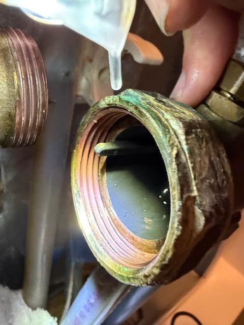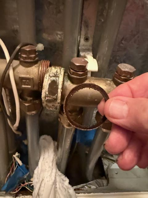 • The V2620005 was the correct gasket and fixed the leak. I was surprised to find a brass rod inside the manifold. It was connected and didn't budge and I presume that it is there to collect air bubbles and move them to the vent.