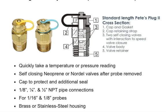 PT "Petes" plugs are super handy, easy to use, inexpensive, unbreakable. Use pressure or temperature gauges in them, of whatever quality you want.