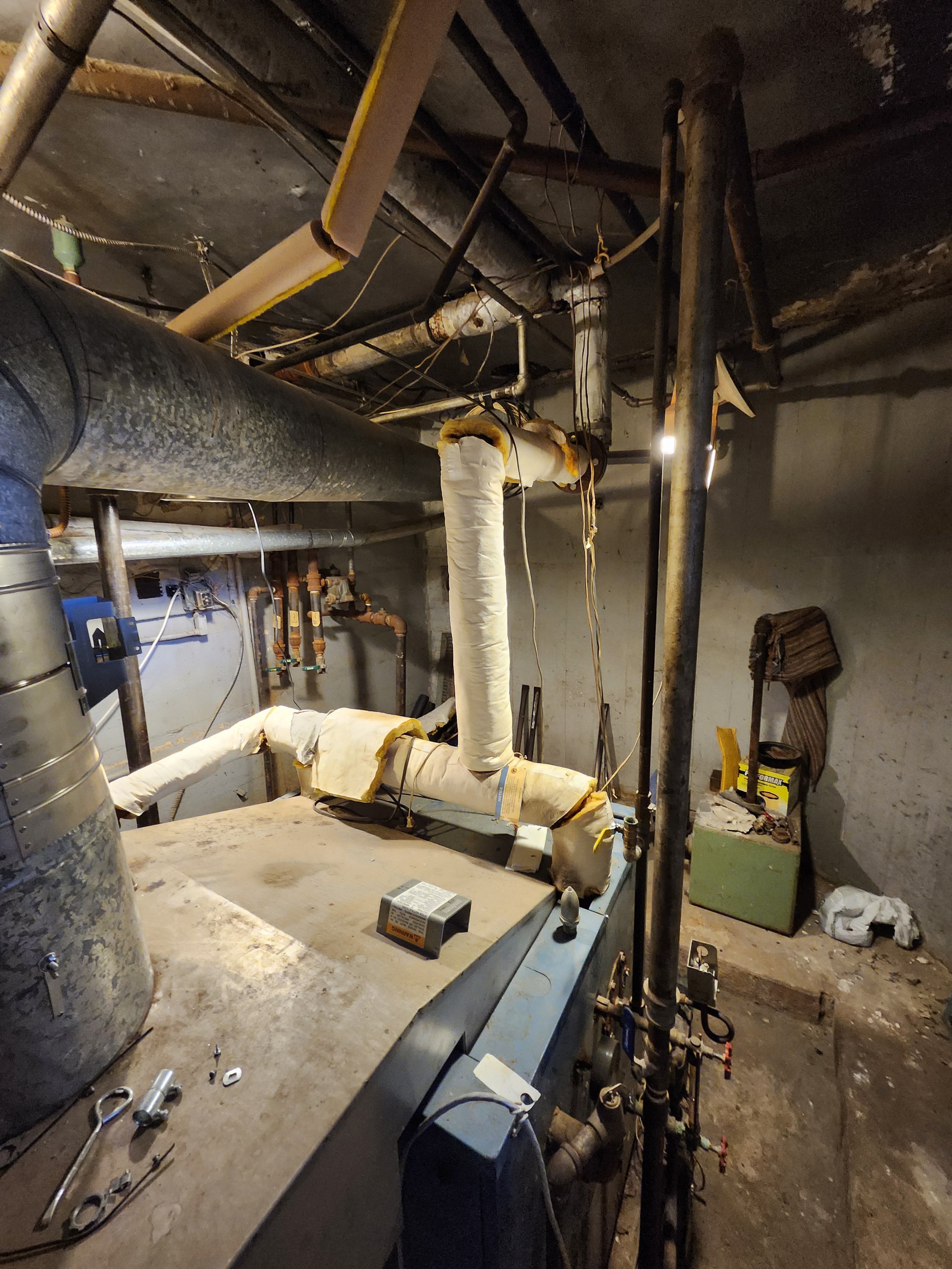 The current offtake (attached pic) has a lateral about 76 inches off the floor with a 2 1/2 flange ending the old supply piping. I'm kinda surprised that lateral doesn't make noise on start up but maybe there is just enough pitch to drain before the next cycle. Anyway if we tie into the existing flange with a short nipple and elbow I can rotate the new pipe downward and aim it toward the supply take-off on the new header. But 76 inches down to 50-ish for the header doesn't get me quite enough run to keep 45 degrees. Also I wind up with a bunch of back to back elbows to make the connection work. Is this a bad idea? Swings seem good for piping flexibility but I'm not sure on the steam flow? We could do a drop header but even that would be a bit scant.