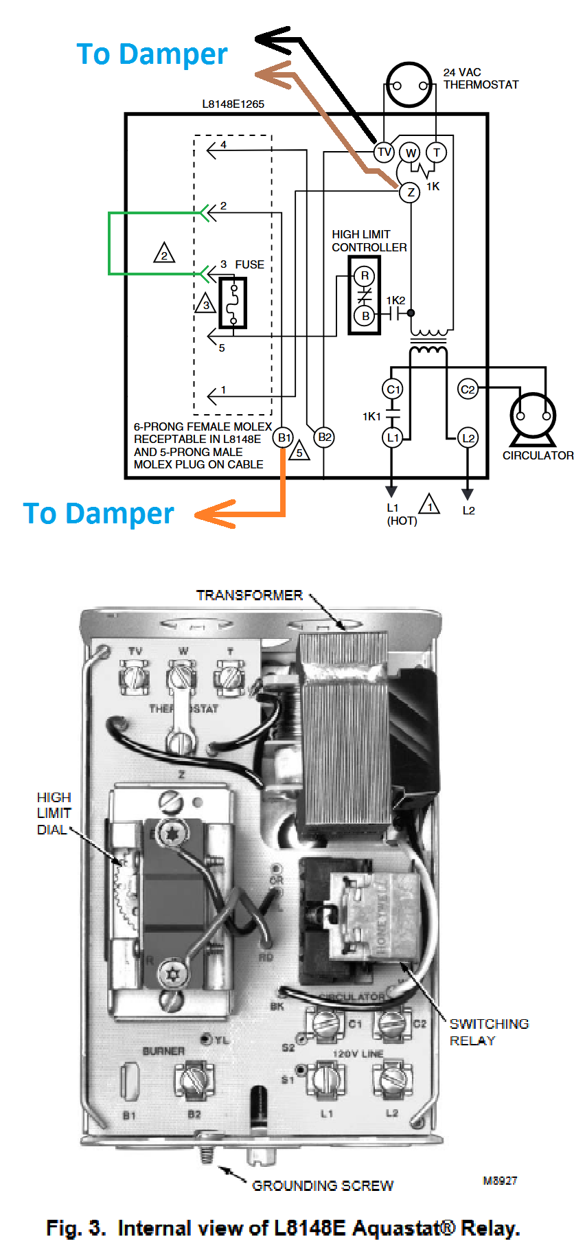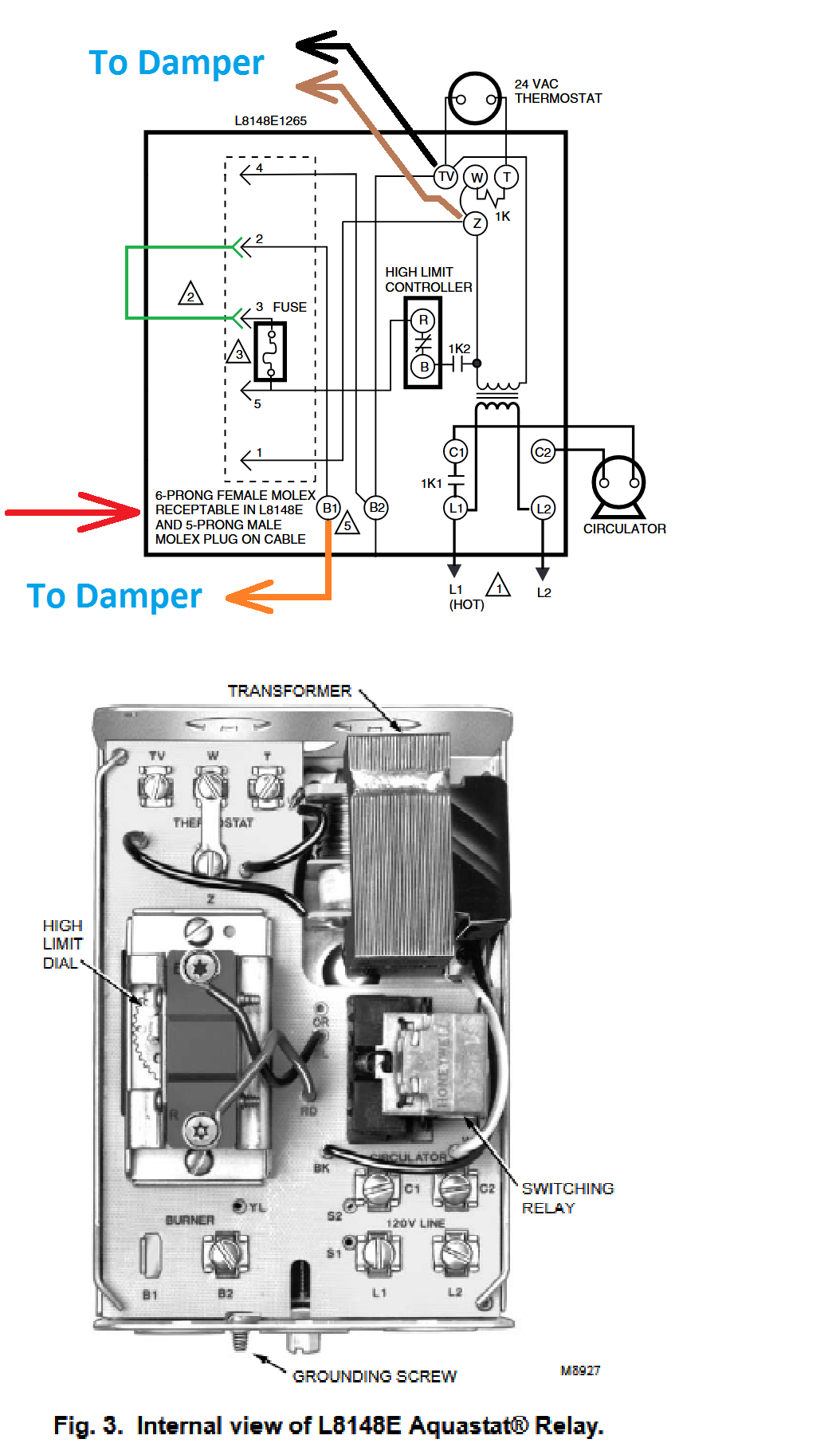 Currently the black damper wire is hooked up to TV and the brown wire to w on the top part of aqua stat. The orange wire is hooked up to B1. The yellow damper wire is pigtail to a red wire which leads to the safety switch on the flue next to the damper. The other red wire is getting pigtail to gas valve. The safety switch has two red wires.