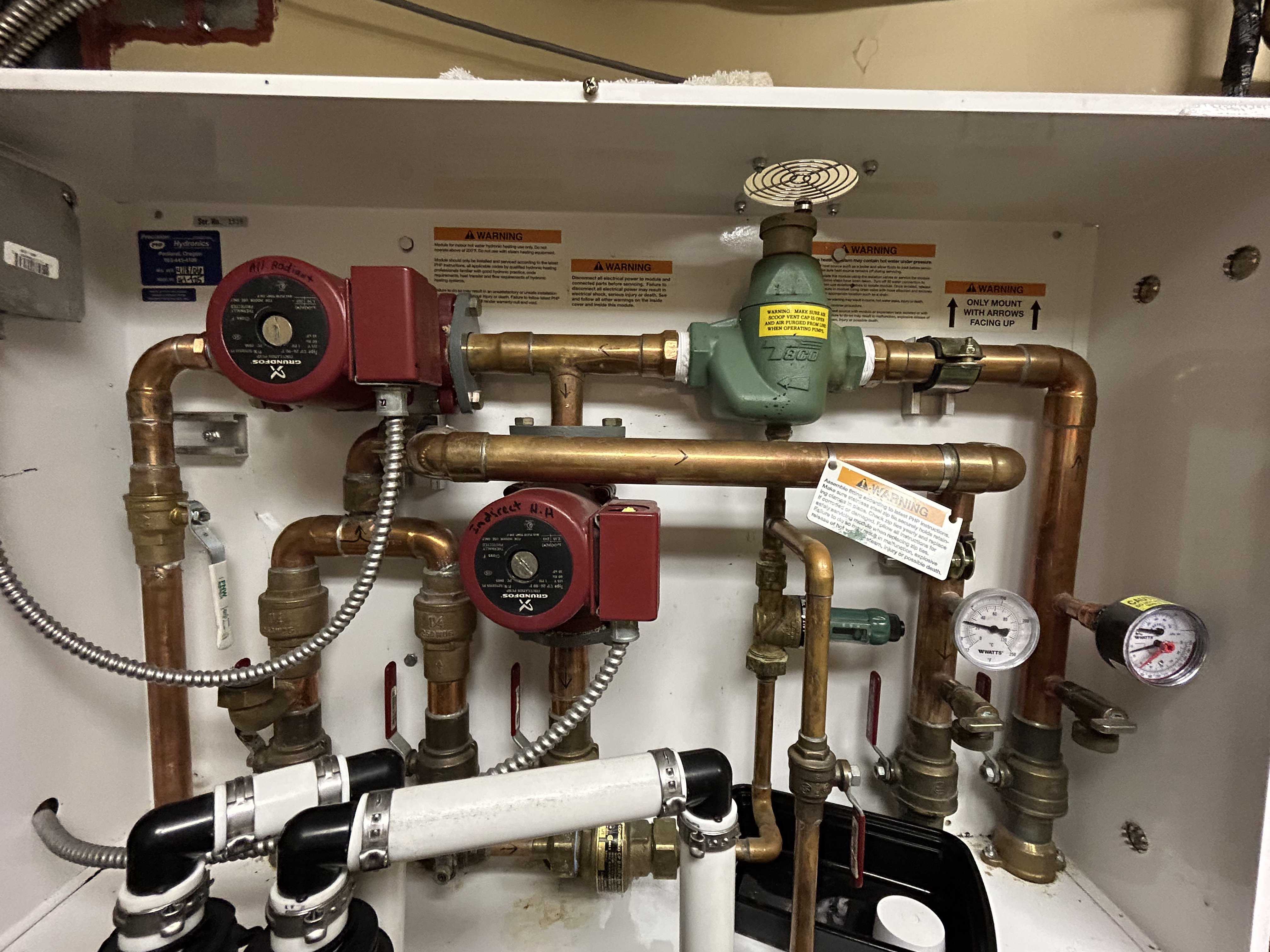 My system pressures seems normal (15-20 psi when hot). My temps are in the 120-125 range. Both manifold pressure and temp gauges appear to be working and normal. Gauges at the boiler all reading normal. My expansion tank bladder seems fine (water on top, air on bottom when doing the knuckle test).