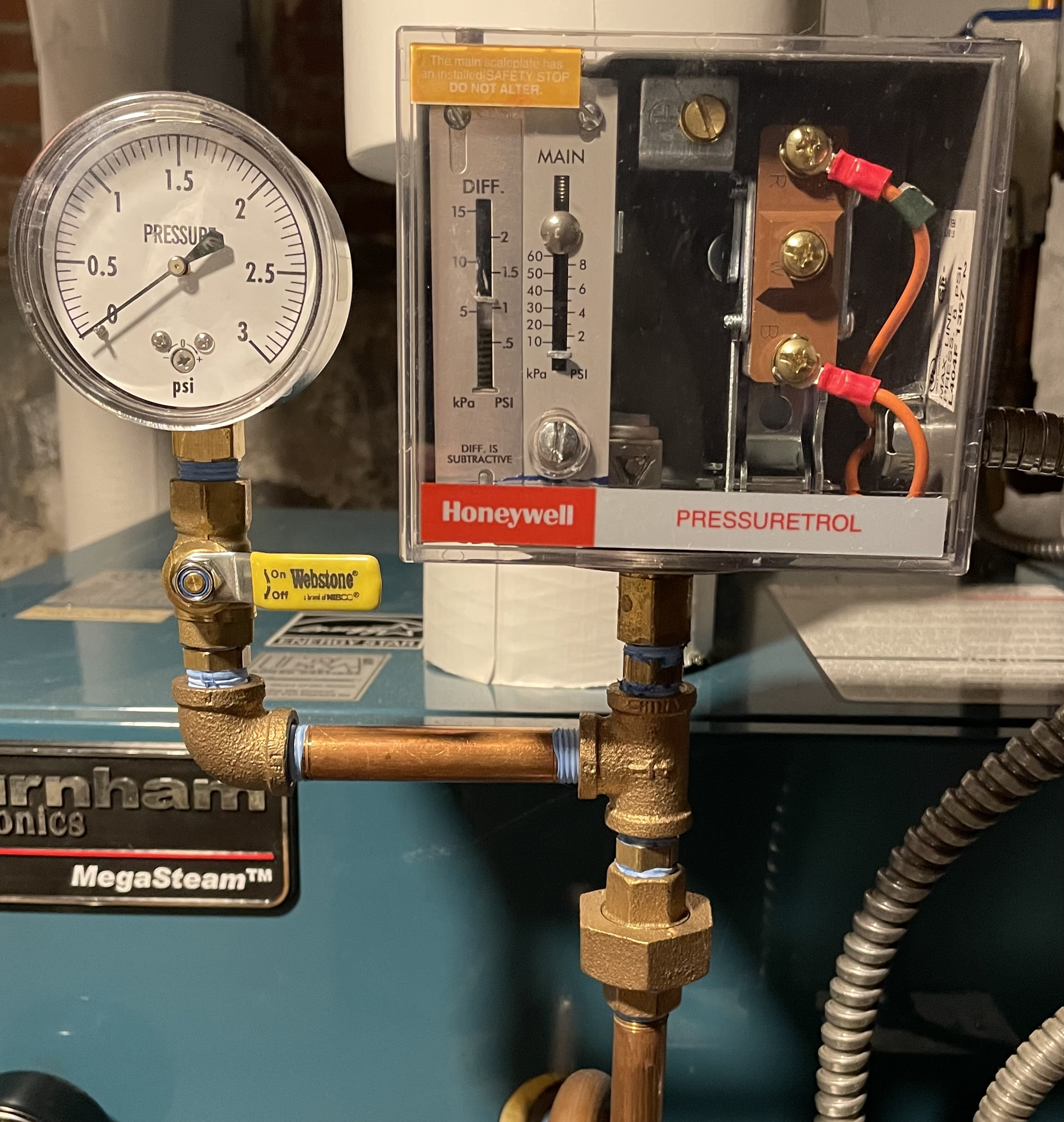 Adding a 1/4” brass union and hex nipple above the pigtail will allow you to avoid having to disconnect the wires next time by simply being able to undo the union nut to unscrew the pigtail. Wash all new piping thoroughly with dish detergent and rinse thoroughly before installing to avoid adding new oil (or soap!) to the boiler water. It may be a good time to add a tee for a low pressure gauge as well so you can calibrate your pressuretrol settings to be accurate to the desired operating pressure range. I’ll post a photo here later tonight of an example pigtail assembly.