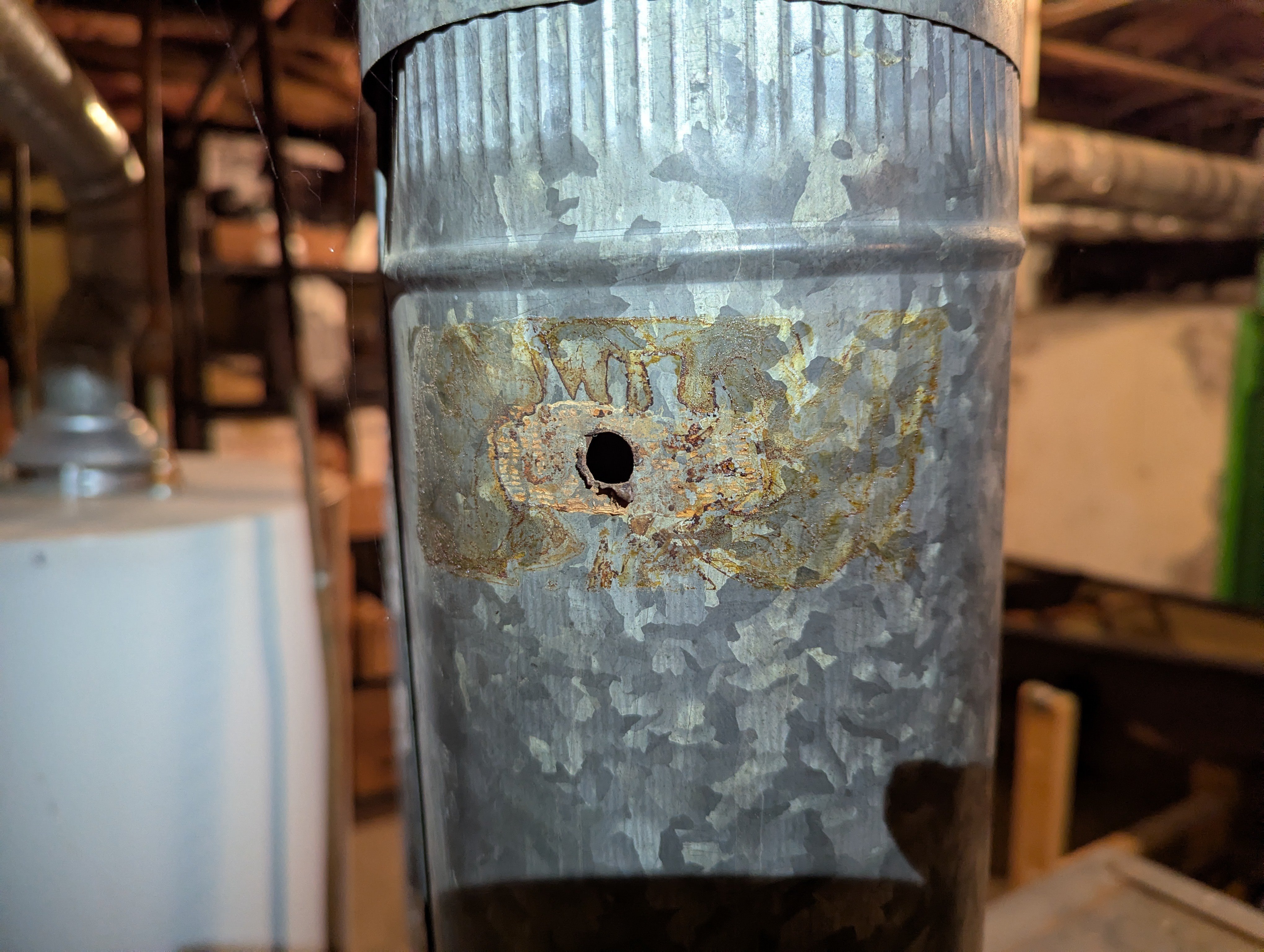 My partner's new to her 1880s home is heated with a Weil-Mclain E-5-B boiler coupled with classic radiators. There's a Grundfos circulator in the system so it's obviously not a steam system at this point in its life . I see no information attached showing "last service" but the pressure tank is dated as of 10/6/16 and other updates appear to have occur back then. I see a screen that use to be attached to the bottom of an exhaust shroud with duct tape that's now drooping and no longer acting as a screen. There's also an uncovered hole in the exhaust vent that I would assume measurements might have once been taken.