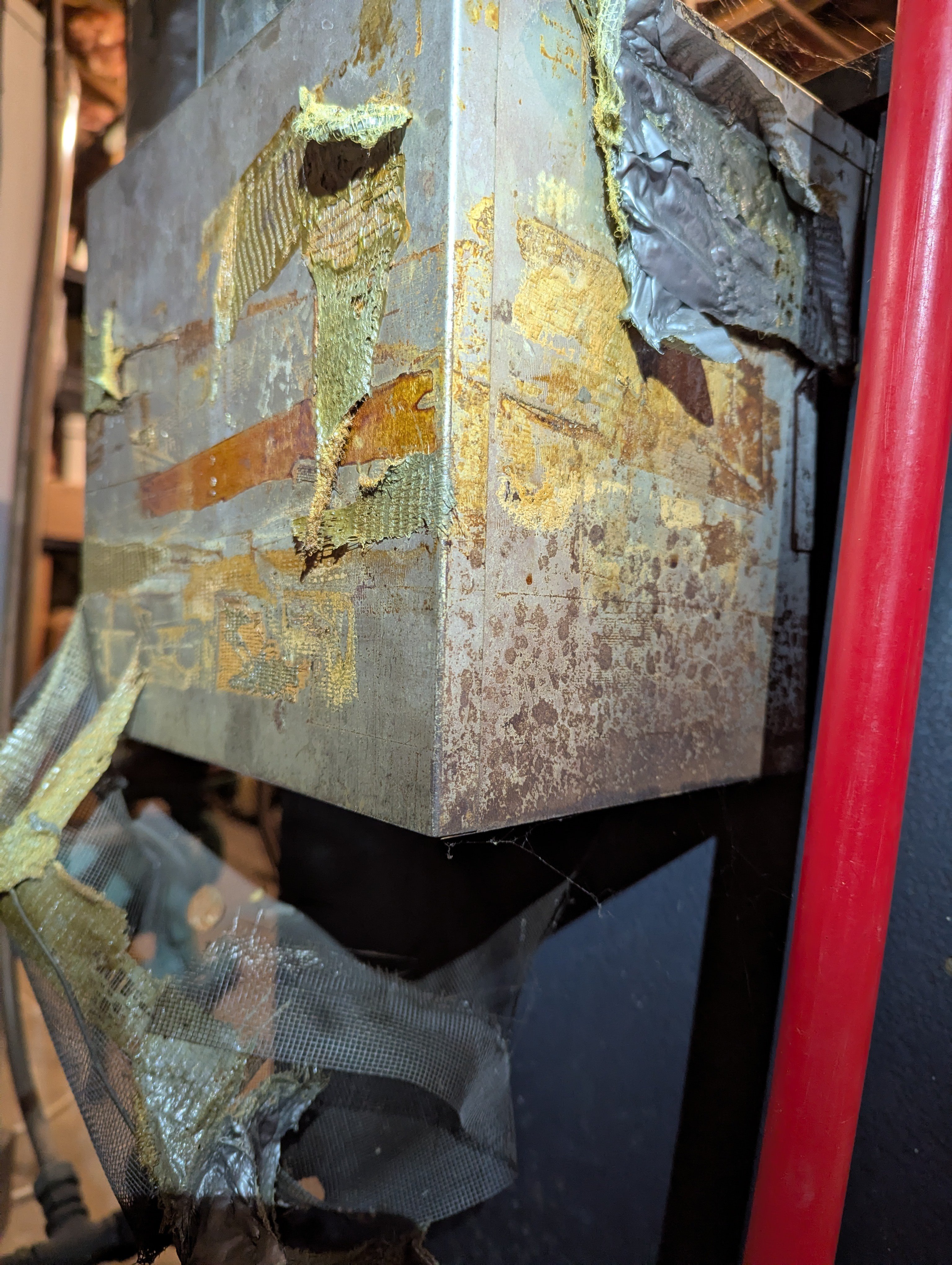 Don't know what the duct tape is all about but it shouldn't be there and the flue pipe is falling apart with the joint in the second picture almost open. Really should not run this the way it is . Need a good tech to check it out (if one exists).