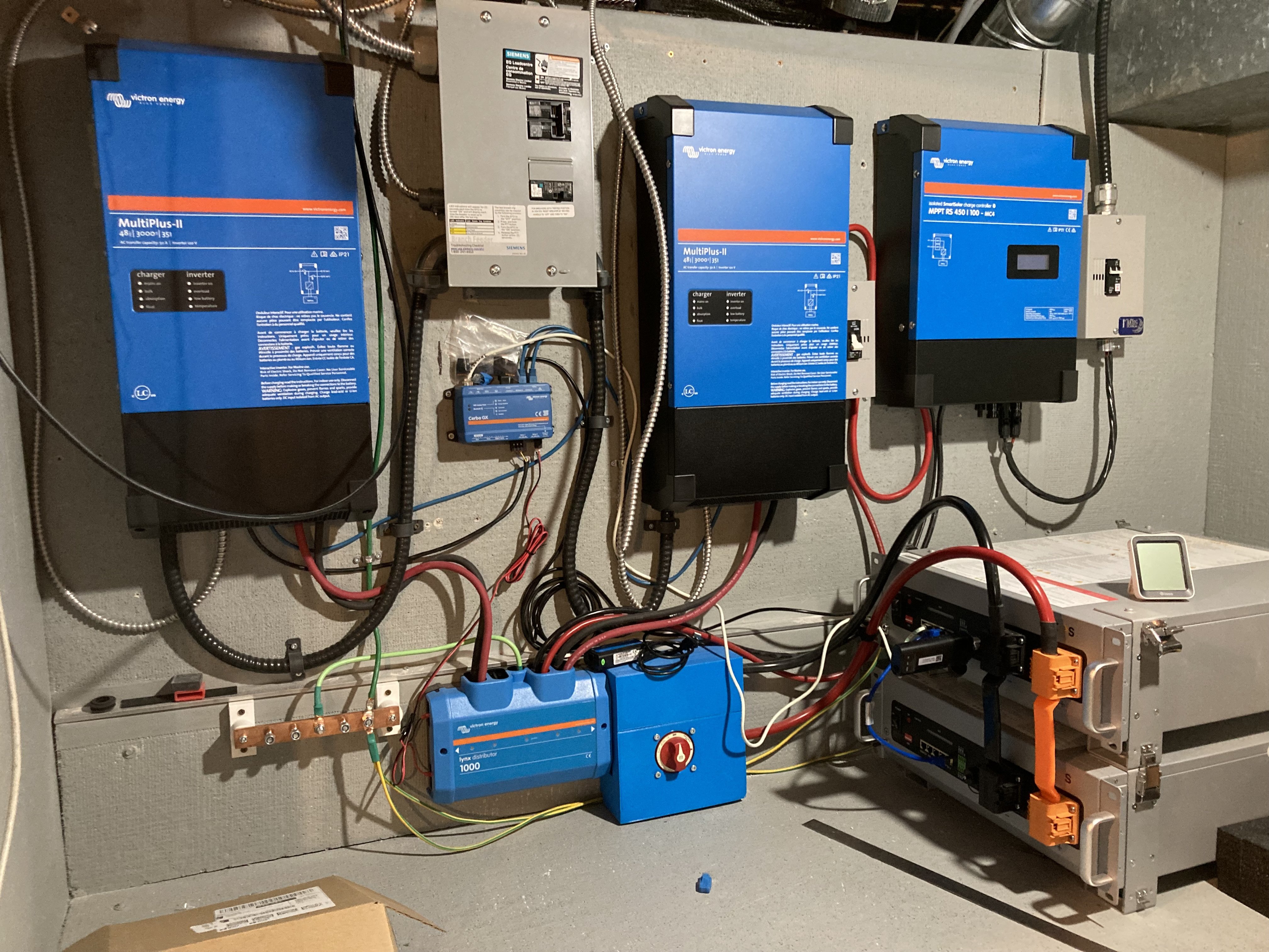 I have a 4 kilowatt solar array that keeps my Pytes batteries charged and Victron inverters that send AC to the 10 gallon water tank. If I have a day or two of no sun I need the boiler to kick in.