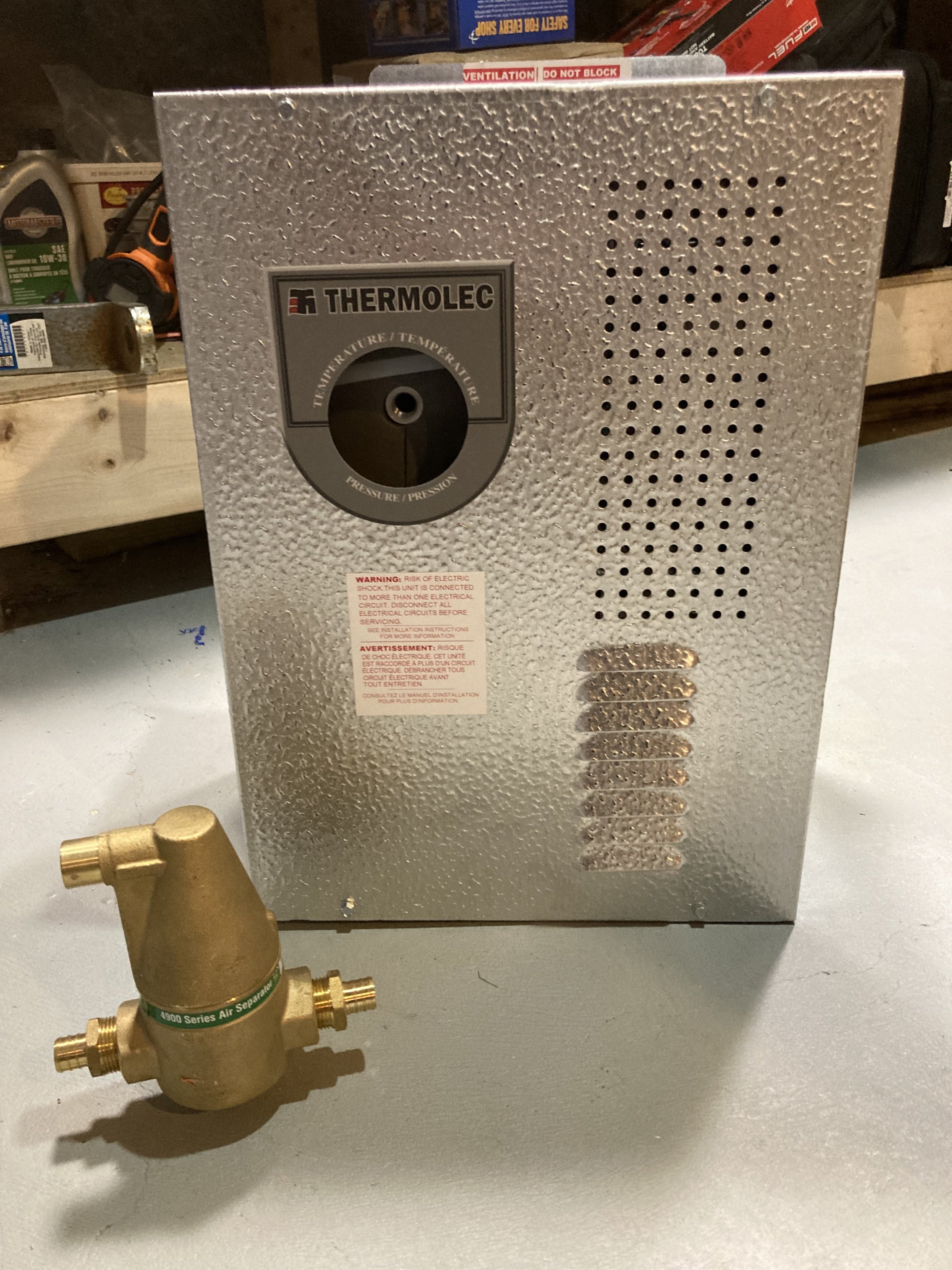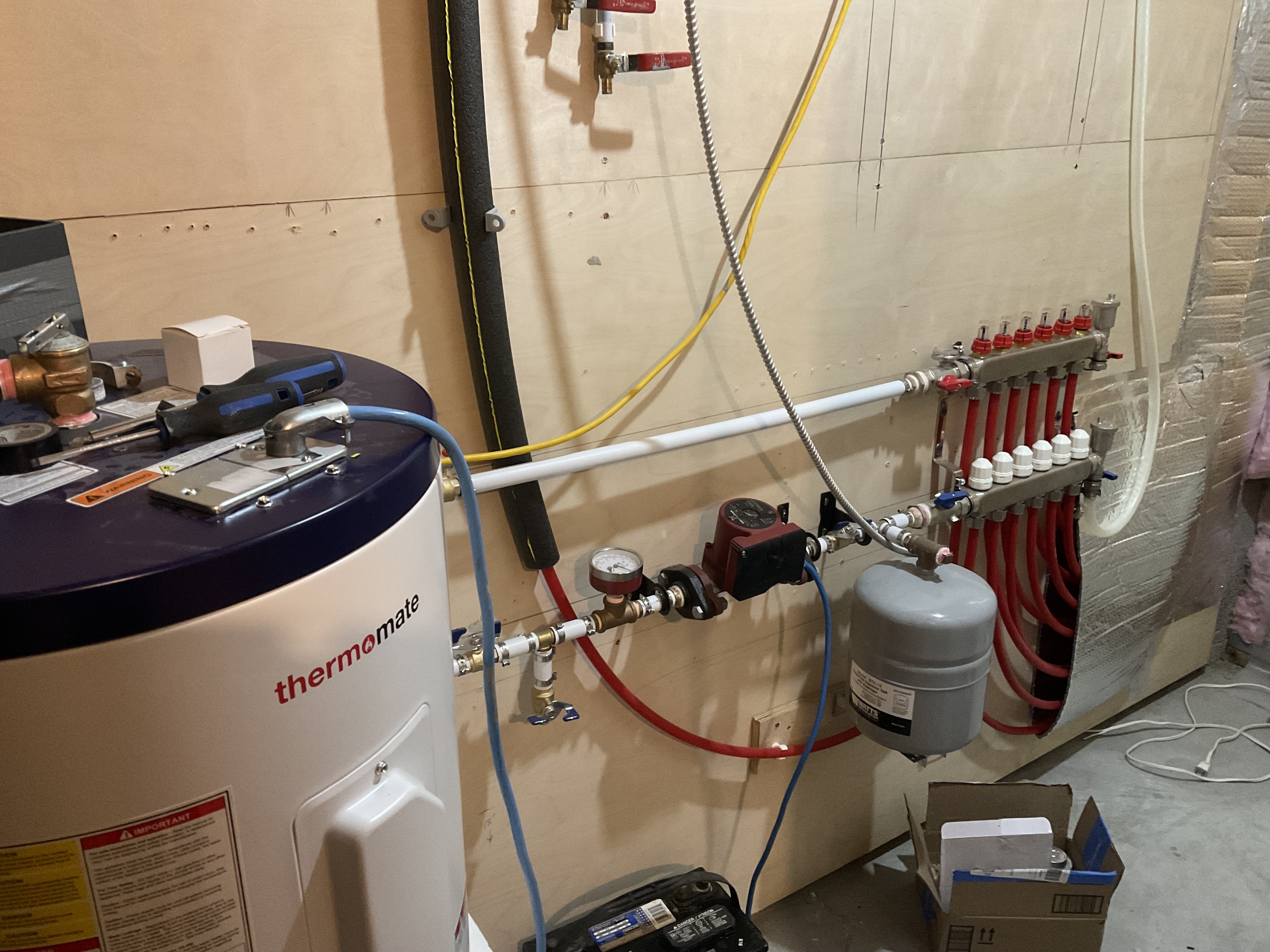 I have a small underfloor heating setup and the primary hot-water source is a 10 gallon tank heated by solar. It heats the water up to about 90 degrees F into the loops and 80 degrees F on the cold return, feeding 4 loops about 250 feet each. I purchased a new Thermolec 3K mini boiler and air separator to add to the system. I need some advice on the correct location of the new boiler and separator. Can I feed the hot water outlet from the hot water tank to the cold inlet of the boiler and then the hot outlet of the boiler to the loops. The cold return from the loops would feed the cold of the hot water tank? see attacked pic. Also, what would be the best location for the air separator?