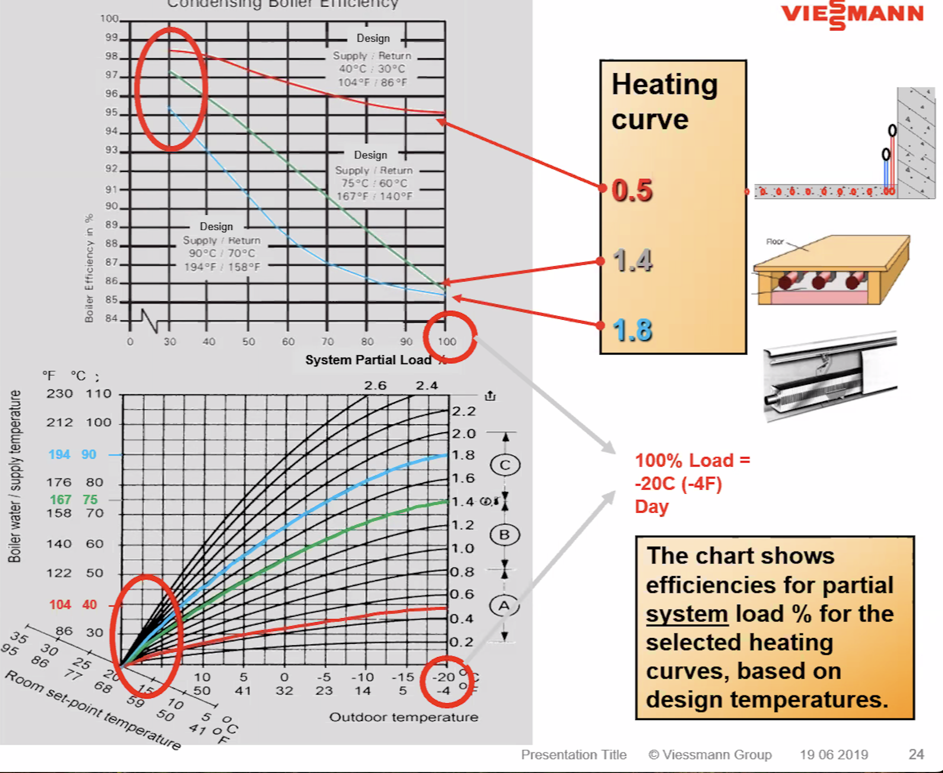 So I will set the cast iron at about 135 supply temp with a mixing valve, using the cast iron return water as the cold buffer via the tank (115 return water on design day). I'll program the ODR based on about 185 on design day for the baseboards. I'll get a delta T of about 30 on design day, so my return combined water temp on design day should be getting close to condensing if not condensing (although that's not really my goal, just a nice side benefit). I'll get very good condensing on moderate days.