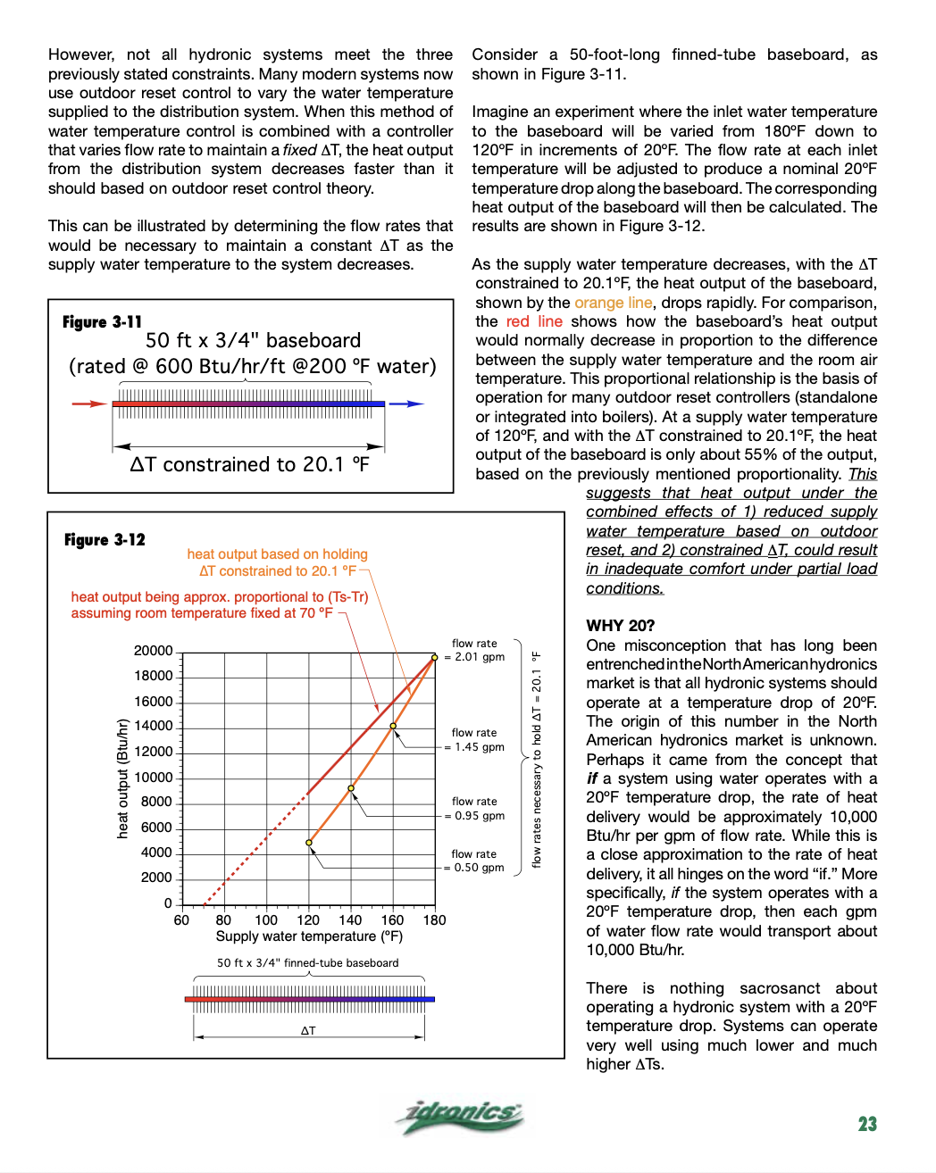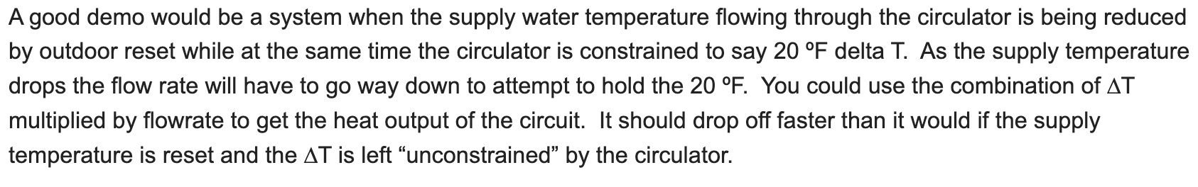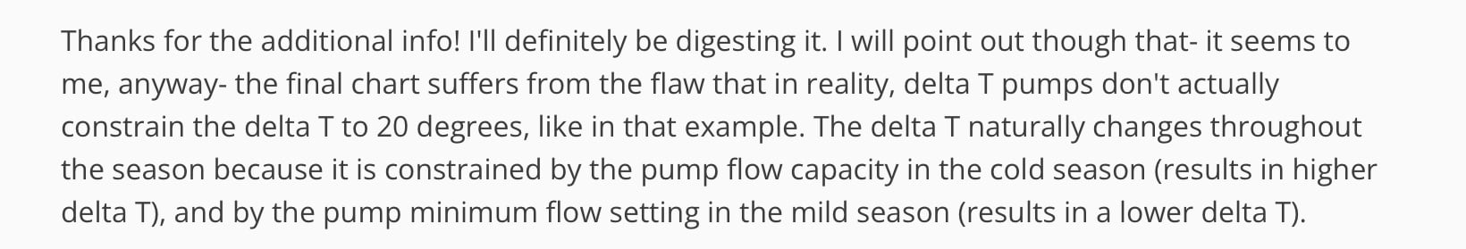 Thanks for the additional info! I'll definitely be digesting it. I will point out though that- it seems to me, anyway- the final chart suffers from the flaw that in reality, delta T pumps don't actually constrain the delta T to 20 degrees, like in that example. The delta T naturally changes throughout the season because it is constrained by the pump flow capacity in the cold season (results in higher delta T), and by the pump minimum flow setting in the mild season (results in a lower delta T).
