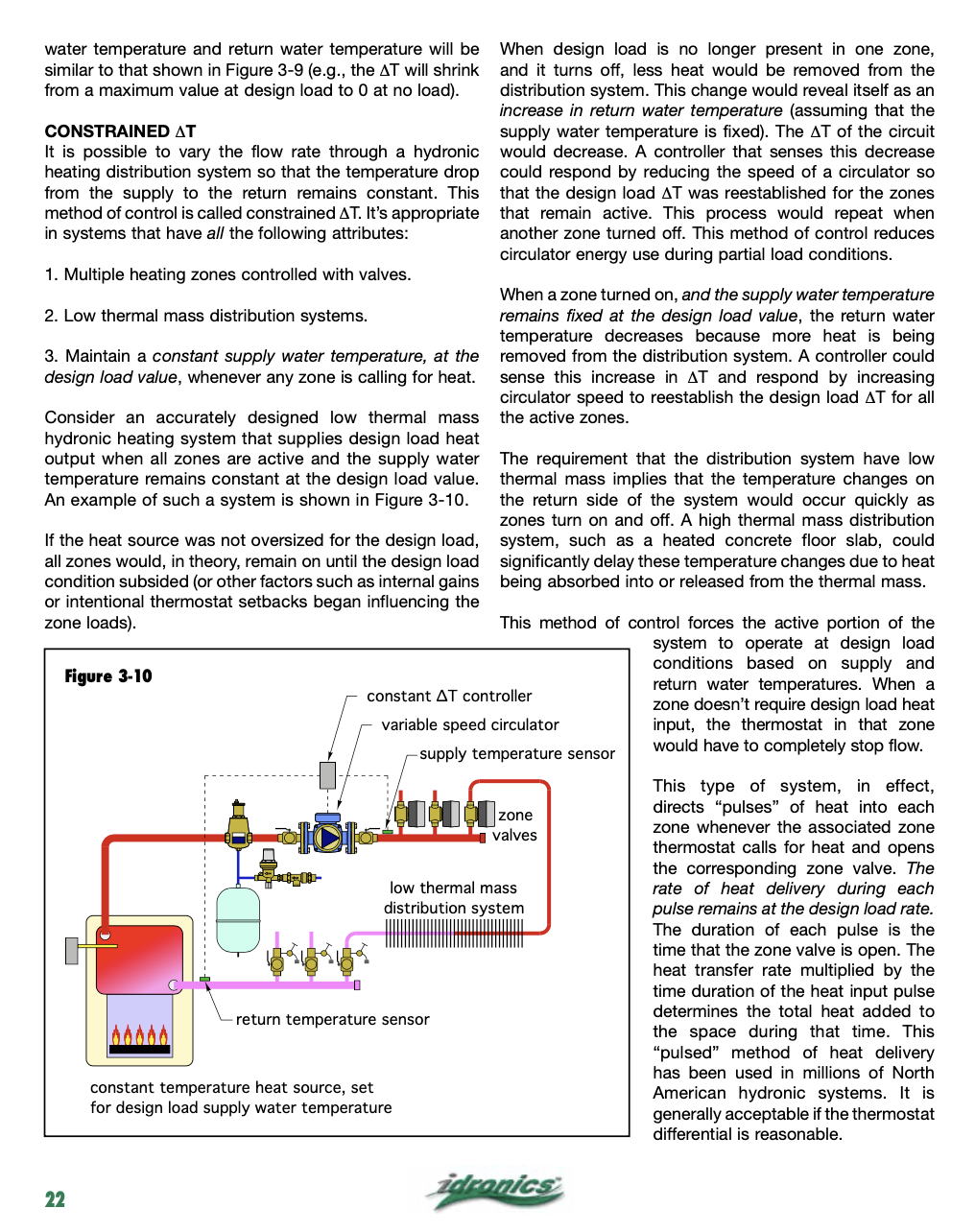 The load on a building constantly changes based on temperature, wind, occupant use, internal gains, etc. So ideally a heating system that could monitor that and change accordingly would be good. Allowing the delta T to move around as loads inevitably change a common way to control.