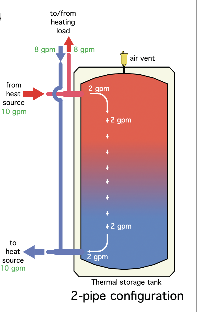 If you do a 2 or 3 pipe buffer, the connection at the tank needs to be sized up, as it is the hydraulic separation function. In this example at least 1-1/4" for the 10 gpm requirement.