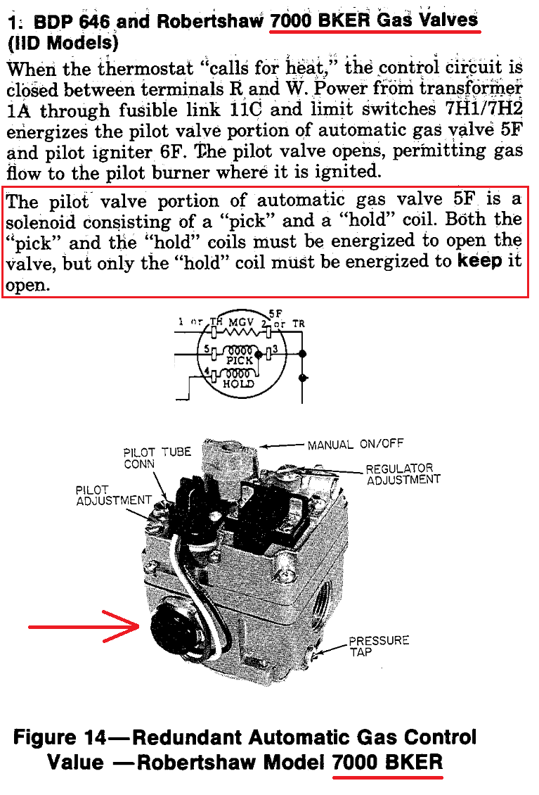 This is often the case with Pick and Hold circuits on the pilot solenoid. It is similar to the old series 10 thermostat circuits that will pull in a relay when W and B get power but W and R powered will not pull in the relay coil. The Hold circuit gets a lower voltage from the center tap of the transformer secondary coil while the Pick circuit will get the full 24 volt secondary coil to open the valve with the stronger solenoid. You would get it if you had the entire wiring diagram referenced in that info you found.