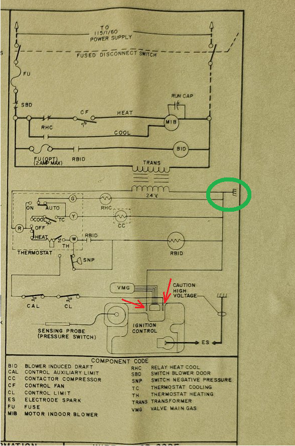 If you find that the power does fall out for a short second, then you can assume the ignition control system and the gas valve are operating properly and start looking at the controls that lead up to the two Red arrows in @109A _5's photo of the diagram. Once you have verified that the voltage drops out at that point you need to go to the rest of the circuit leading up to the Ignition control one step at a time as I indicated in this illustration.