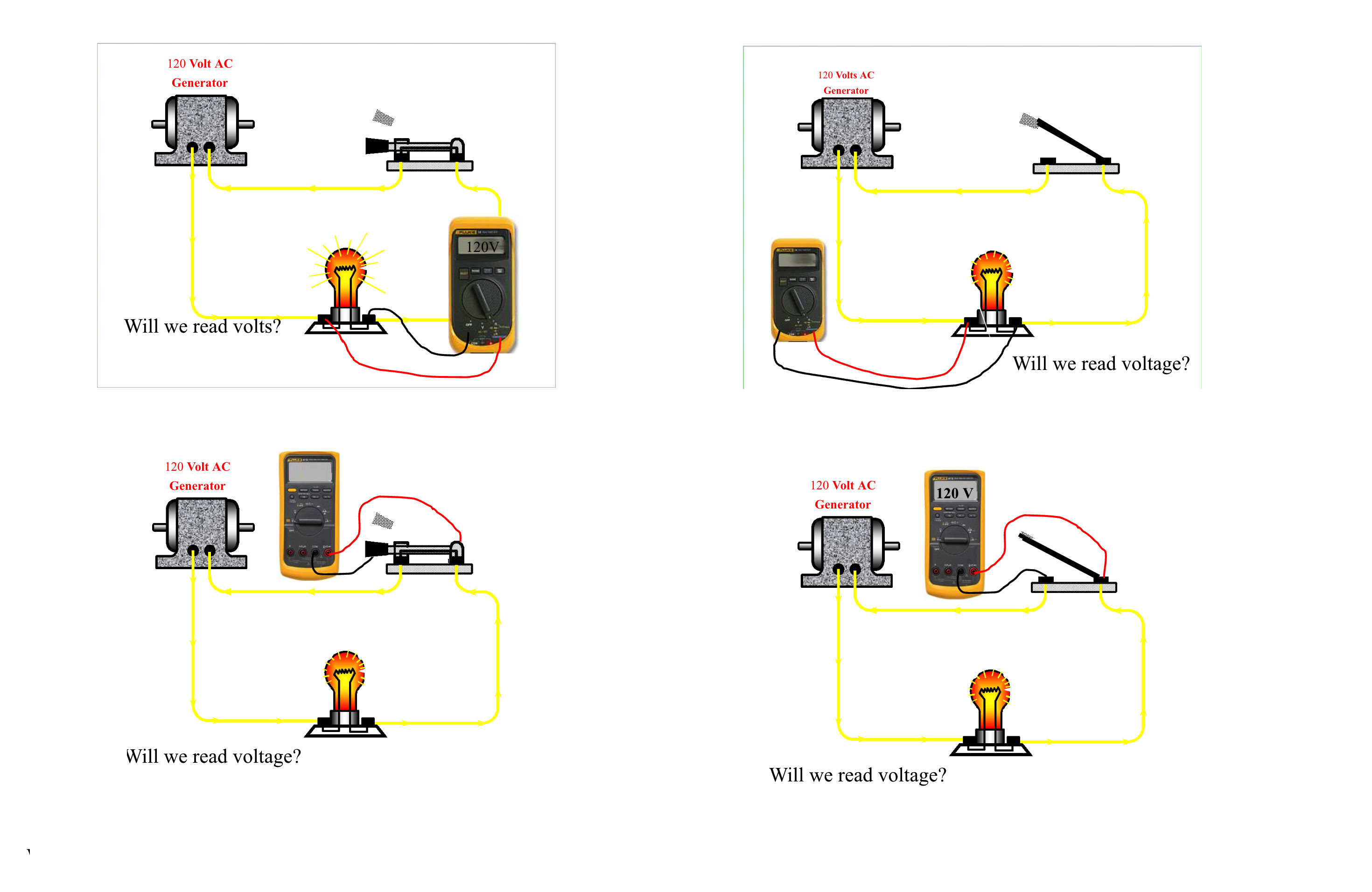 Measuring voltage at the load with the switch closed (turned on) you will get a voltage reading. With the switch open (turned off) you will not get a voltage reading and the load will not operate. On the bottom illustration you get the opposite result. Look closely at the bottom right illustration to see that the load will conduct the electricity to the meter on one side of the switch that is open the the return path will conduct the electricity back to the source. That is why the meter will read voltage when the switch is open
