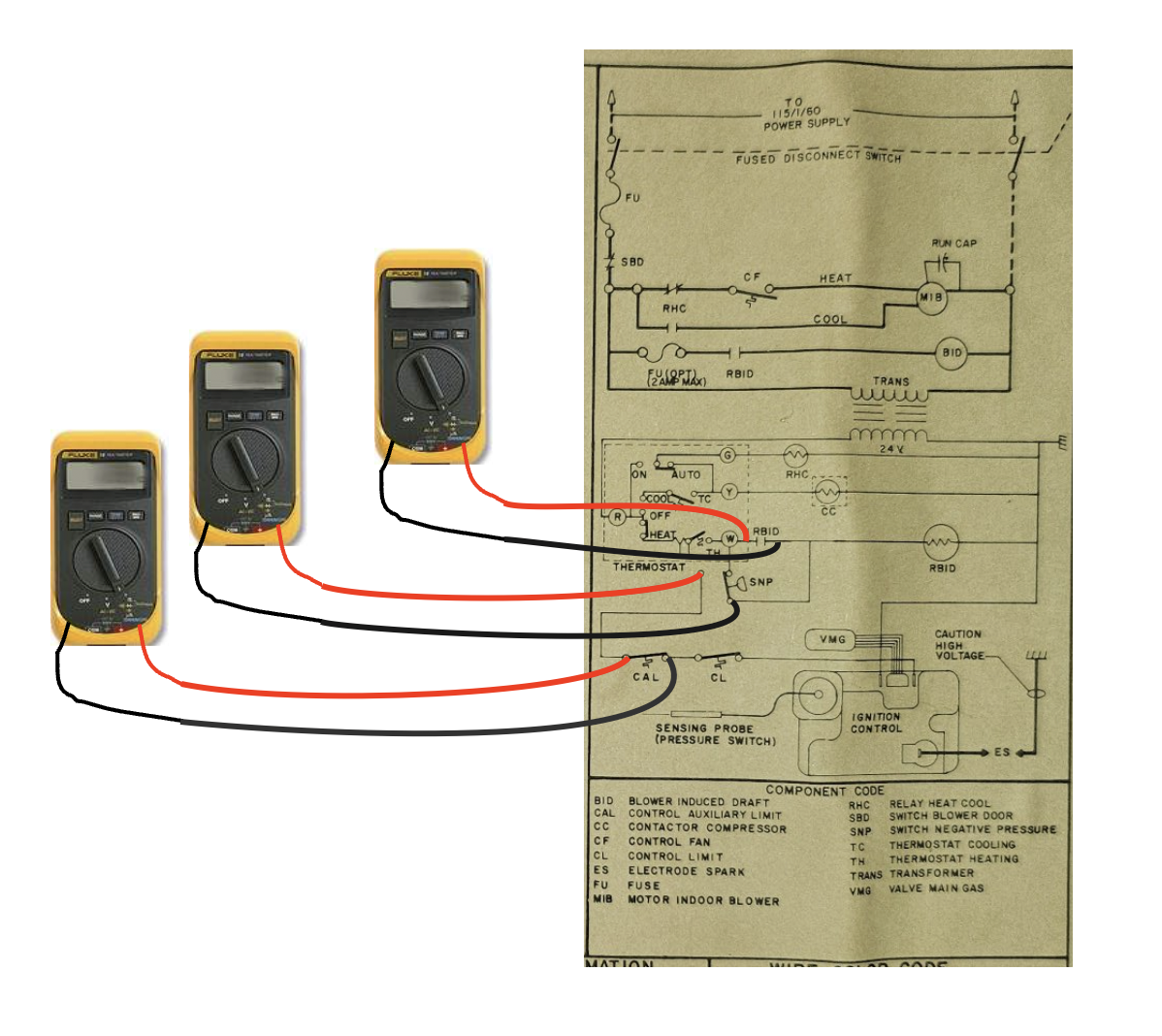 If the top meter reads voltage when the burner stops, then that relay that is hanging loose in the left side of the cabinet is what is causing the problem. If top meter does not read voltage during the failure then move to the middle meter. If the middle meter reads voltage when the flame goes out then the pressure switch is the reason for the main flame outage. If that does not read any voltage in the middle configuration then move to the next location and continue to follow this procedure until you locate the contacts that are opening.