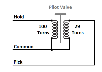 I found this (below), it appears the three wire portion is the Pilot Valve 'Pick' and 'Hold' coils. Don't know which wire is which, maybe only the hold coil needs to be energized after the main valve is open. Although the 7.1 volts still seems odd.