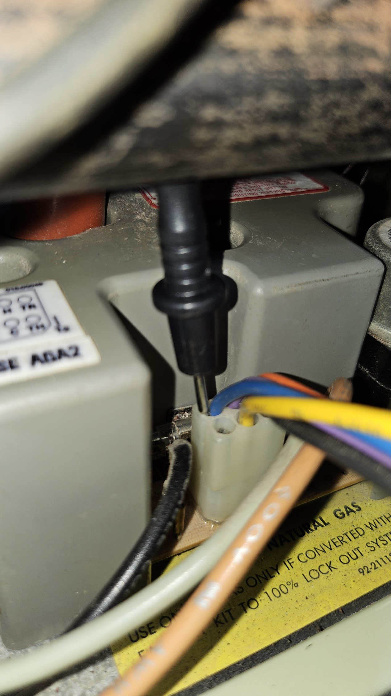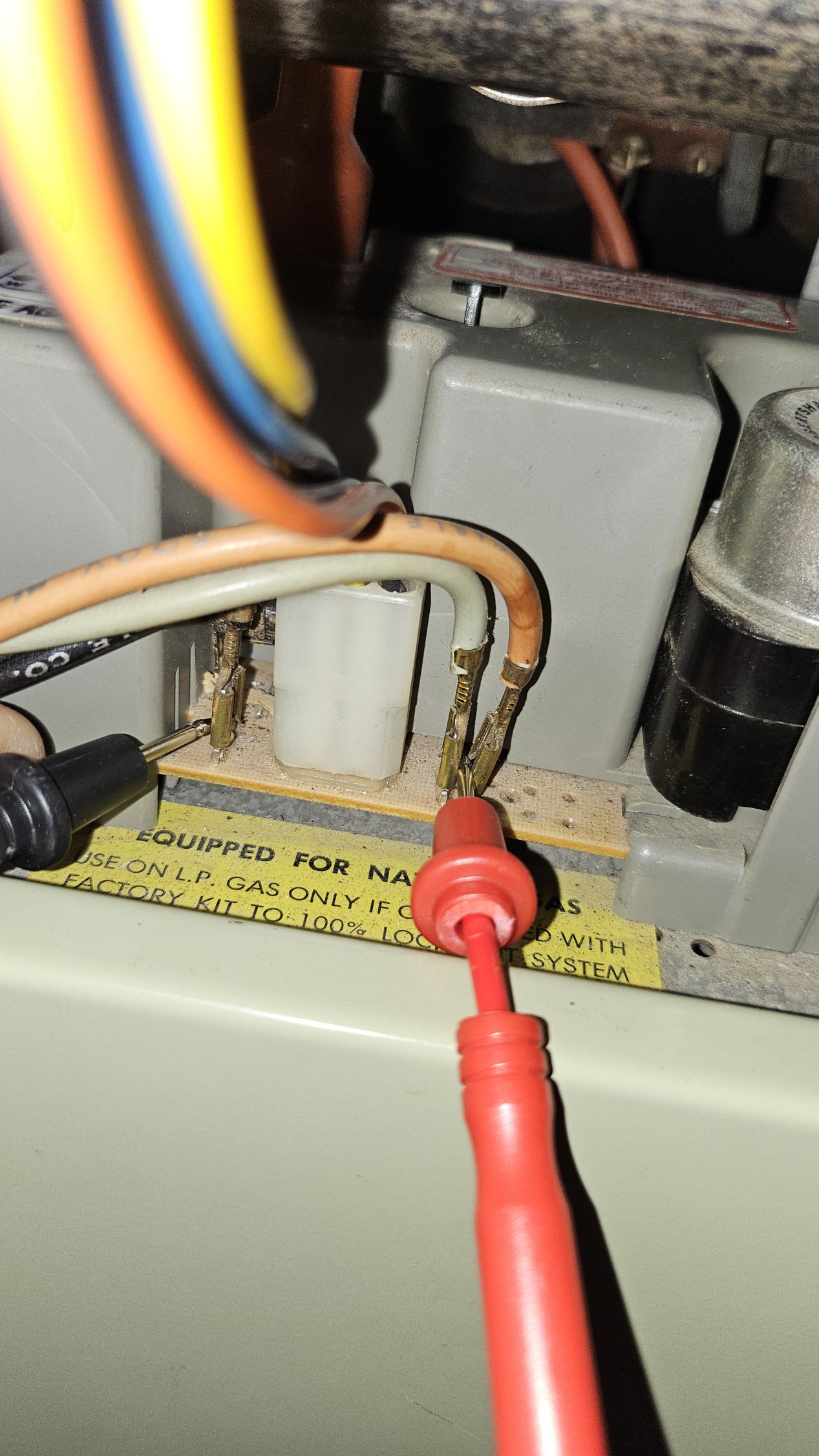 I measured between ground and the blue wire where it plugs into the control board at the bottom of the picture. That wire goes to the gas valve connector and then to the black disk on the bottom of the gas valve. (I don't know what that part is called)